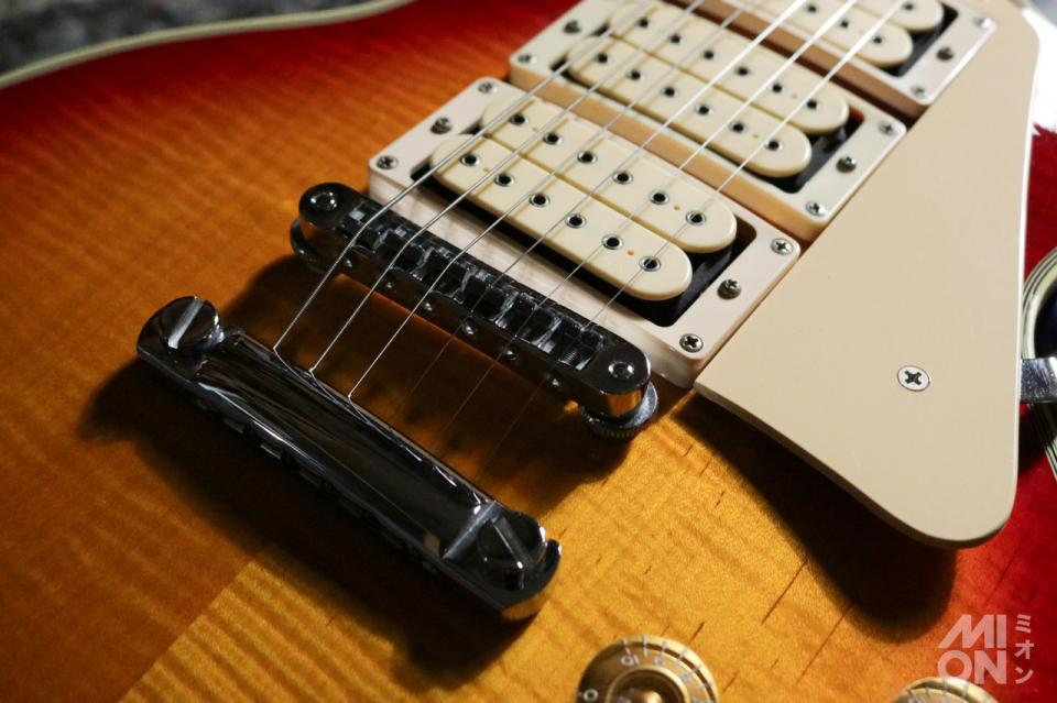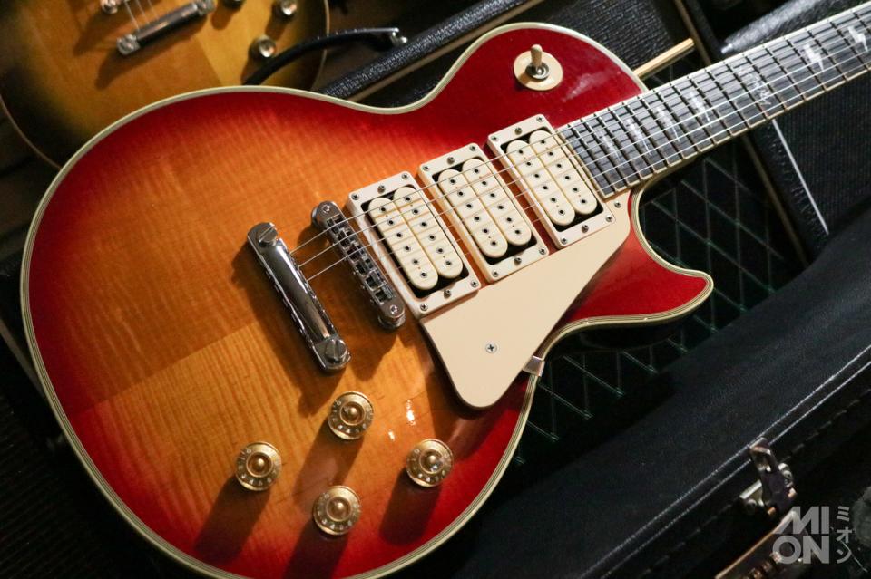 豪華なフレイム・メイプルトップにマホガニーボディ、マホガニーネック、エボニー指板を採用。太すぎず握りごたえのあるネックグリップ、ハードウェアはグローバーペグ、チューン・オー・マチックブリッジ&テイルピースを採用。