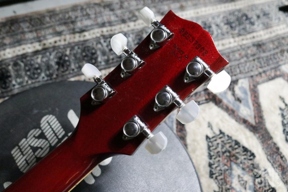 カスタムショップ製はバックプレートやトラスロッドカバーがメタルプレートになっていたり、ペグがパーロイドになっているといったハードウェアの違いがあるようですが、レギュラーラインナップながら豪華な木材をこちらも使用しており、独自の外観も相まって貴重なレスポール!