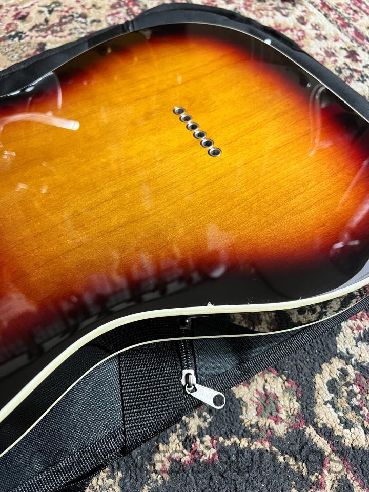 ピックガードにシールが残っています。ボディ裏側バインディング付近に傷が見られます。