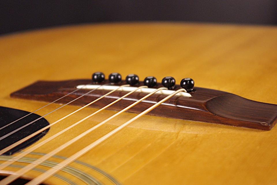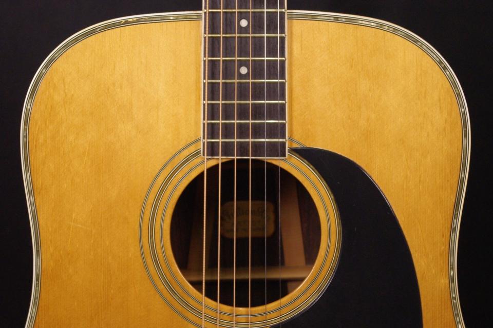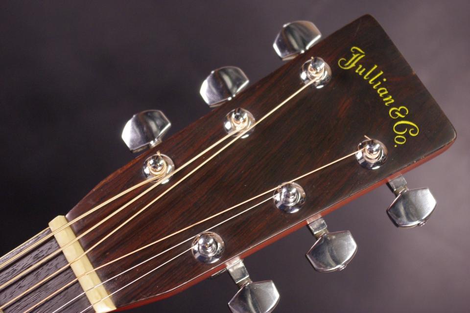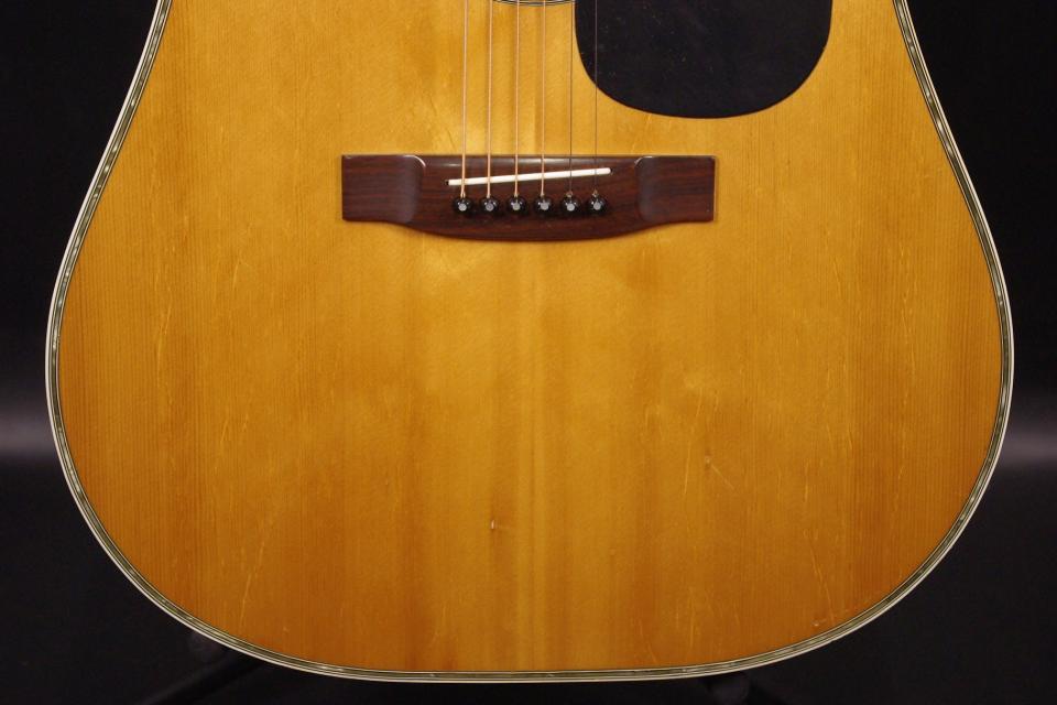 1970年代国産 Julian Artist モデルで入荷しました!!トップにはベアクローの入ったスプルース単板を採用しています。サイドバックはローズウッド合板が有力で3ピースバックになっているのが特徴です。ペグ、ピックガード、ブリッジはオリジナルで残っていました。50年近く経過していますが傷は少なめで全体的に綺麗に残っています。ネックヒールの接合部分に線が出ていますが表面上で演奏上支障ございません。ストラップピン加工、ピックアップの取り付け加工もございません。ナット幅は約43mmのやや太めのグリップになります。ネックのアングルも理想的でトラスロッドは硬さを感じるところまで締めて調整してあります。フレットは多少減りは出ていますがまだまだお使いいただけます。ブリッジはオリジナルの高さでサドル残は少なめですが弦高は12フレット6弦側で約2.6mm、1弦側で約1.9mmの高さで押さえやすく調整されています。サイドバックは合板ですがバランスのとれた柔らかく落ち着いたサウンドで指で弾くと癒されます!是非この機会にどうぞ!ハードケース付き。
