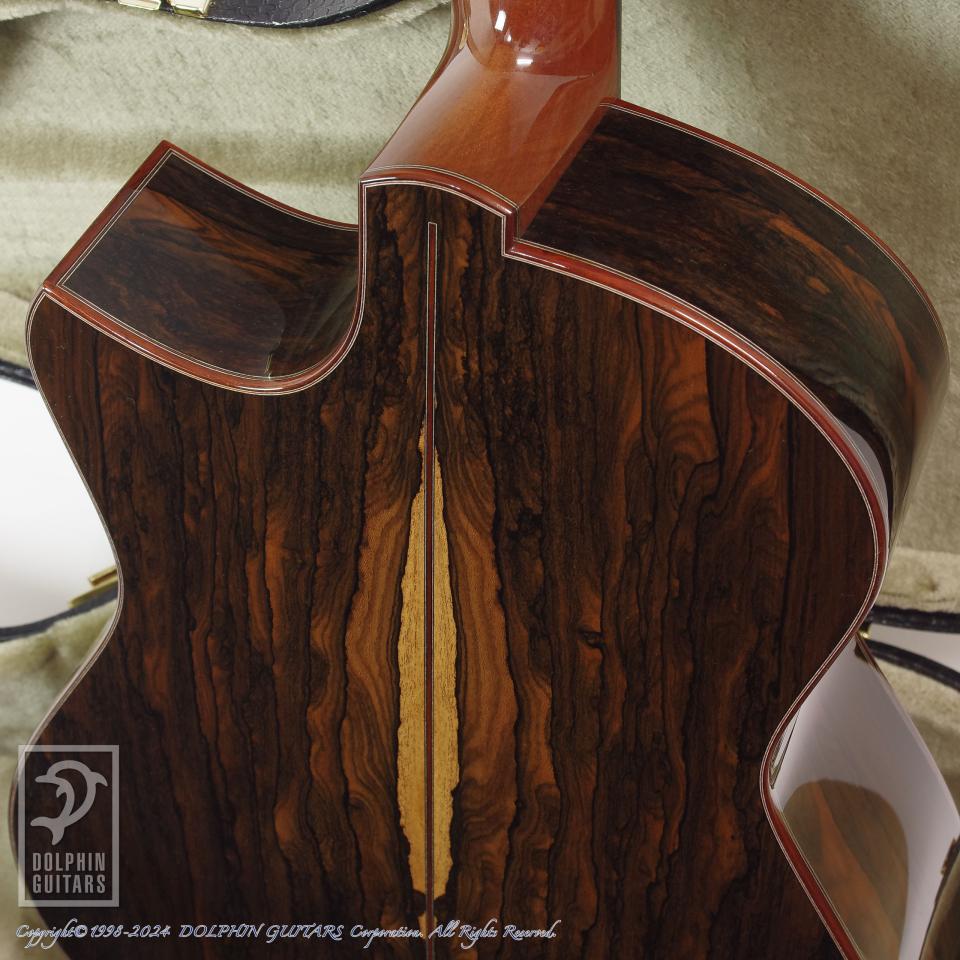 藤井氏が得意とするコーカサス地方のスプルース材を使用し、エキゾチックウッドであるジリコテとを組み合わせ、そのサウンドは重心が低く、太くしなやかさを感じさせ、フジイギターズの大きな特徴とも言える独特なロングサスティーンも効いており、特にバラード調の楽曲を奏でた際のナチュラルリヴァーブ感も心地よく、この表現力の高さは格別であります。