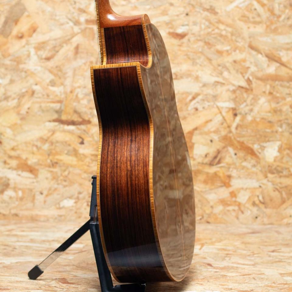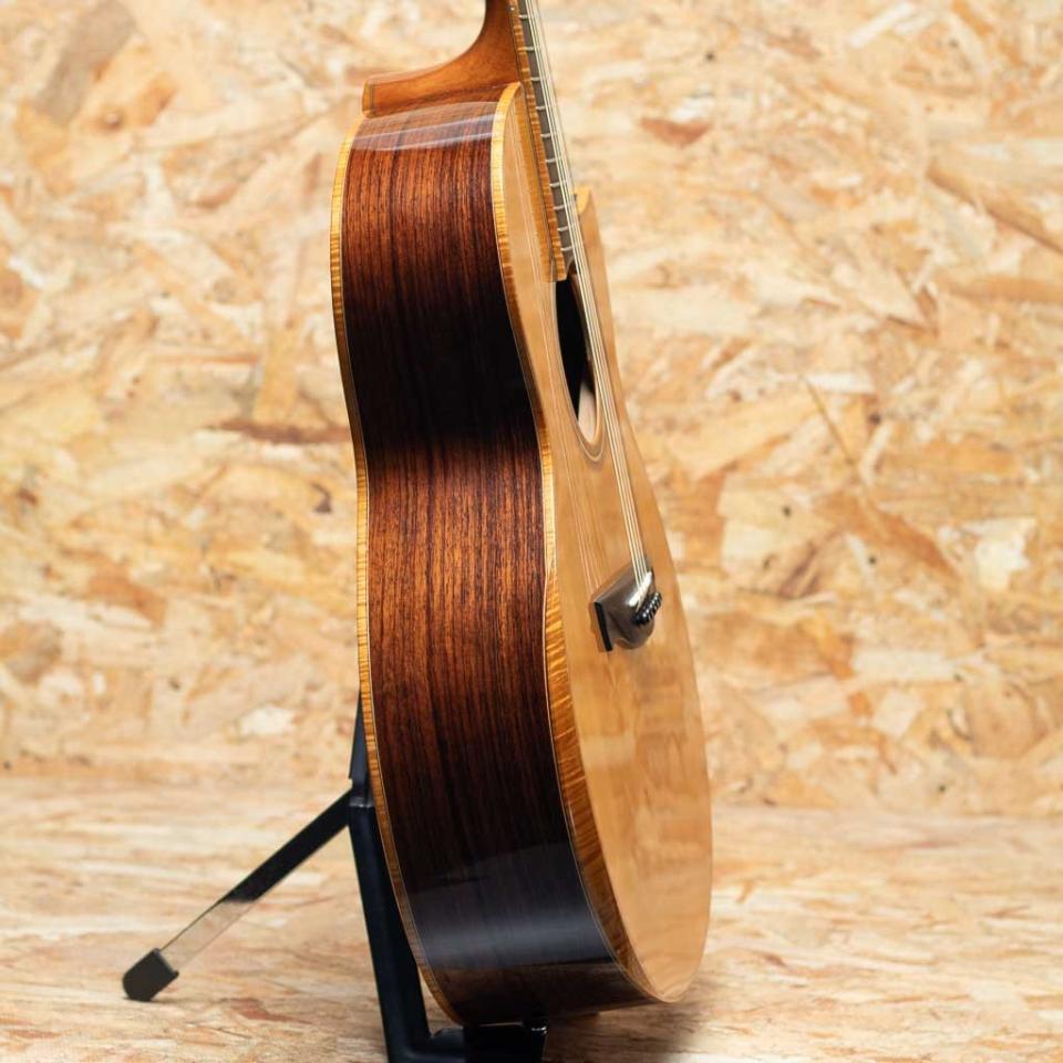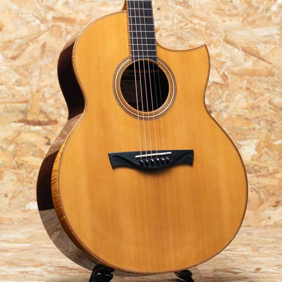 大分県に工房を構える若手製作家”早瀬 輪”。彫刻家である父の影響もあり、幼い頃からモノ作りが好きで、子どもながらに民族楽器等もよく作っていたという早瀬氏。20代に関東の工房等でギター作りを学んだのち、名工”鷲見英一”氏主宰の『Sumi工房』を訪ね、4年半程修行。『Sumi工房』では主にブレース(力木)の接着や、ボディの組み上げ、木地や塗装の研磨、リペアなどを手掛け、ギター製作技術はメキメキと上達。2016年に独立を果たし、大分県竹田市の山間に自身で納屋を改装して工房を立て、アコースティックギター、ウクレレを中心に日々新たな作品を生み出しております。本器はスプルーストップ、ローズウッドサイド&バックのオリジナルスモールジャンボボディモデル"R-CW"2019年製のUSED品。マホガニーネック、エボニー指板&ブリッジ、カーリーメイプルバインディング、ウッドロゼッタ、ホンジュラスローズウッド天神板、ゴトー510ペグ、フローレンタインカッタウェイ&アームレスト(コンター)加工加工付き。シンプルな装飾ながらも木材の特徴を活かした高級感のある仕様です。ヘッド裏の突板にはローレルバールウッドを用いており、個性も演出。トップ、バックともにオリジナルのXブレーシングを採用しておりますが、特にバック面にはXのクロス部分を跨ぐように更に1本ブレイシングが追加されており、一目見ただけでもその独創性、個性が感じられます。低域から高域までのバランスがとても素晴らしく、どのレンジも鮮明さがあるため、耳に届き易く、心地良い。身体に伝わる響き、振動も大きく、弾けば”良いギター”だな、という感覚を素直に与えてくれます。全体の装飾のほとんどをウッドで仕上げており、落ち着いた印象。パーツ類のセットアップも巧みに整えられており、とても弾き易い印象です。経年による塗装の引けや細かな傷、また表板の部分的に角度によっては少し塗装の白濁が見られます。フレットの摩耗等はほとんど見られず使用感はあまり感じられない状態でプレイコンディションは良好です。ギターの製作動画などでも注目を集めた早瀬氏の1本。オリジナルハードケース付属です。