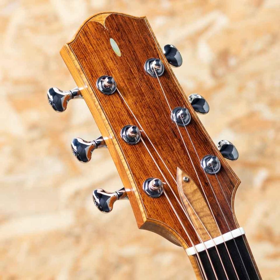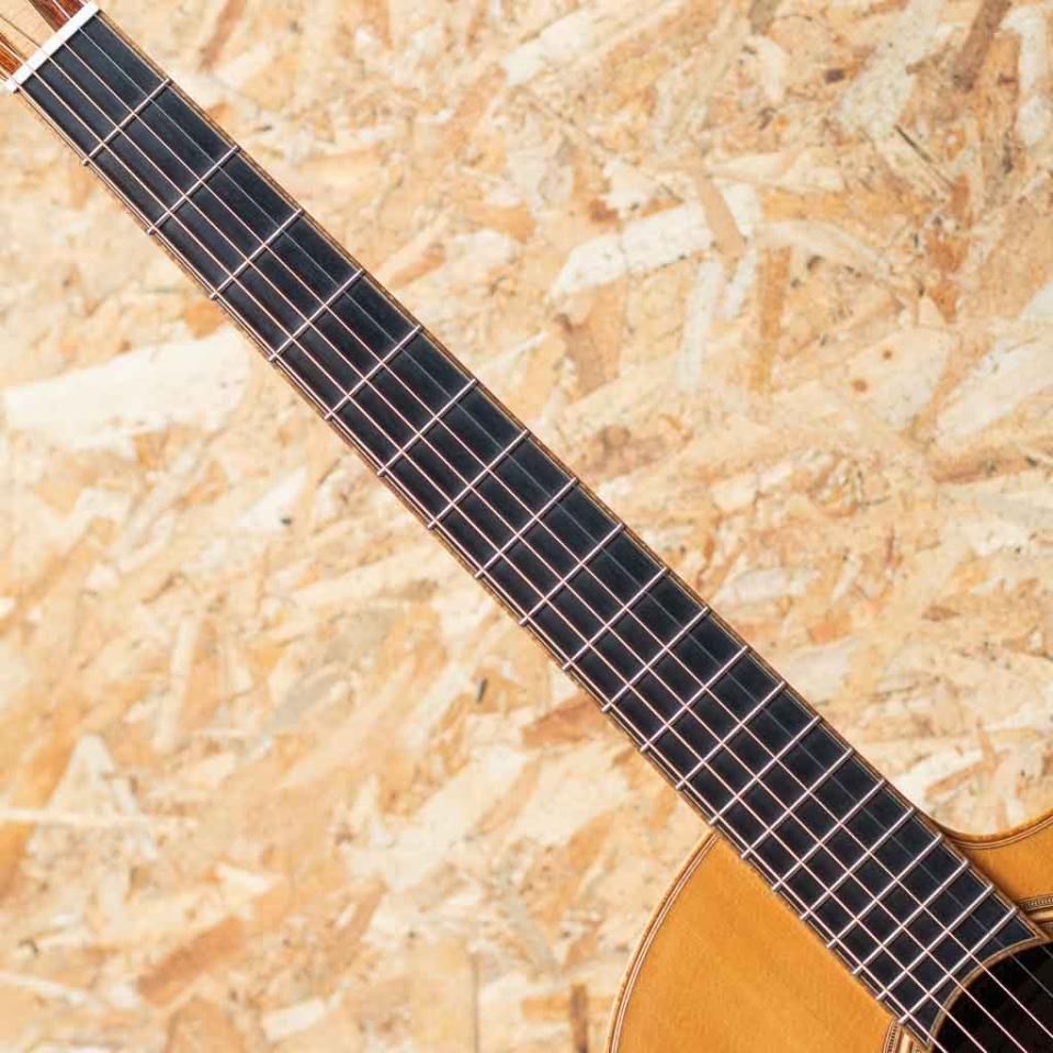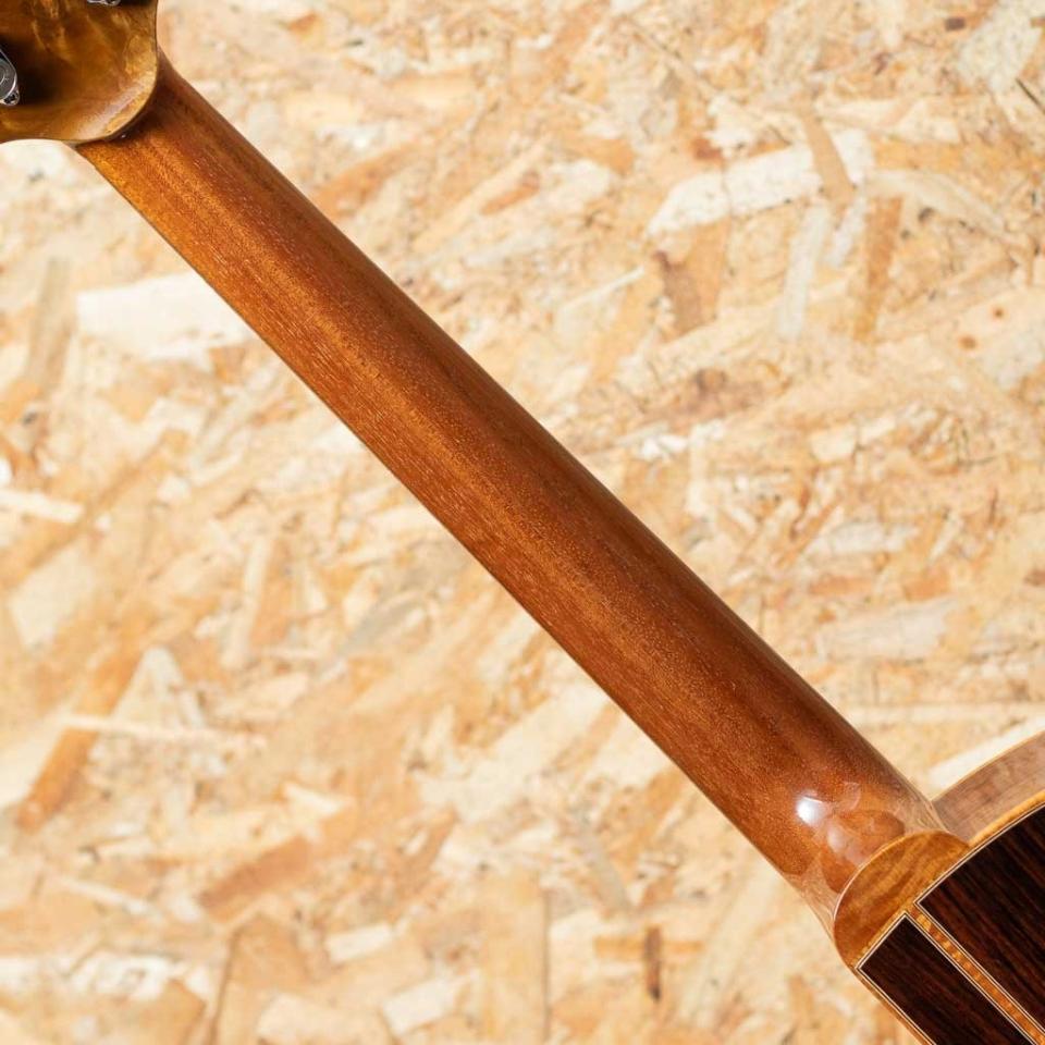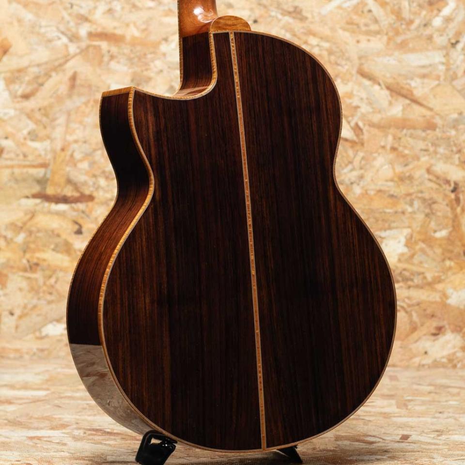 大分県に工房を構える若手製作家”早瀬 輪”。彫刻家である父の影響もあり、幼い頃からモノ作りが好きで、子どもながらに民族楽器等もよく作っていたという早瀬氏。20代に関東の工房等でギター作りを学んだのち、名工”鷲見英一”氏主宰の『Sumi工房』を訪ね、4年半程修行。『Sumi工房』では主にブレース(力木)の接着や、ボディの組み上げ、木地や塗装の研磨、リペアなどを手掛け、ギター製作技術はメキメキと上達。2016年に独立を果たし、大分県竹田市の山間に自身で納屋を改装して工房を立て、アコースティックギター、ウクレレを中心に日々新たな作品を生み出しております。本器はスプルーストップ、ローズウッドサイド&バックのオリジナルスモールジャンボボディモデル"R-CW"2019年製のUSED品。マホガニーネック、エボニー指板&ブリッジ、カーリーメイプルバインディング、ウッドロゼッタ、ホンジュラスローズウッド天神板、ゴトー510ペグ、フローレンタインカッタウェイ&アームレスト(コンター)加工加工付き。シンプルな装飾ながらも木材の特徴を活かした高級感のある仕様です。ヘッド裏の突板にはローレルバールウッドを用いており、個性も演出。トップ、バックともにオリジナルのXブレーシングを採用しておりますが、特にバック面にはXのクロス部分を跨ぐように更に1本ブレイシングが追加されており、一目見ただけでもその独創性、個性が感じられます。低域から高域までのバランスがとても素晴らしく、どのレンジも鮮明さがあるため、耳に届き易く、心地良い。身体に伝わる響き、振動も大きく、弾けば”良いギター”だな、という感覚を素直に与えてくれます。全体の装飾のほとんどをウッドで仕上げており、落ち着いた印象。パーツ類のセットアップも巧みに整えられており、とても弾き易い印象です。経年による塗装の引けや細かな傷、また表板の部分的に角度によっては少し塗装の白濁が見られます。フレットの摩耗等はほとんど見られず使用感はあまり感じられない状態でプレイコンディションは良好です。ギターの製作動画などでも注目を集めた早瀬氏の1本。オリジナルハードケース付属です。