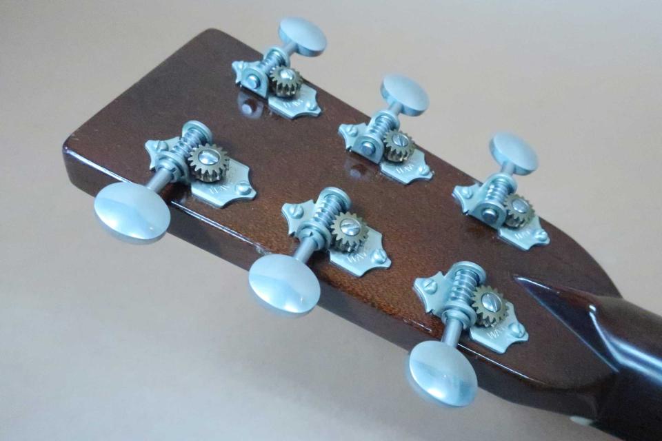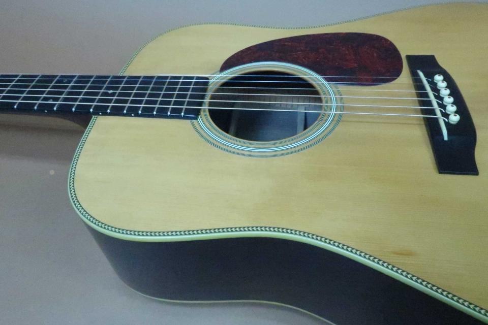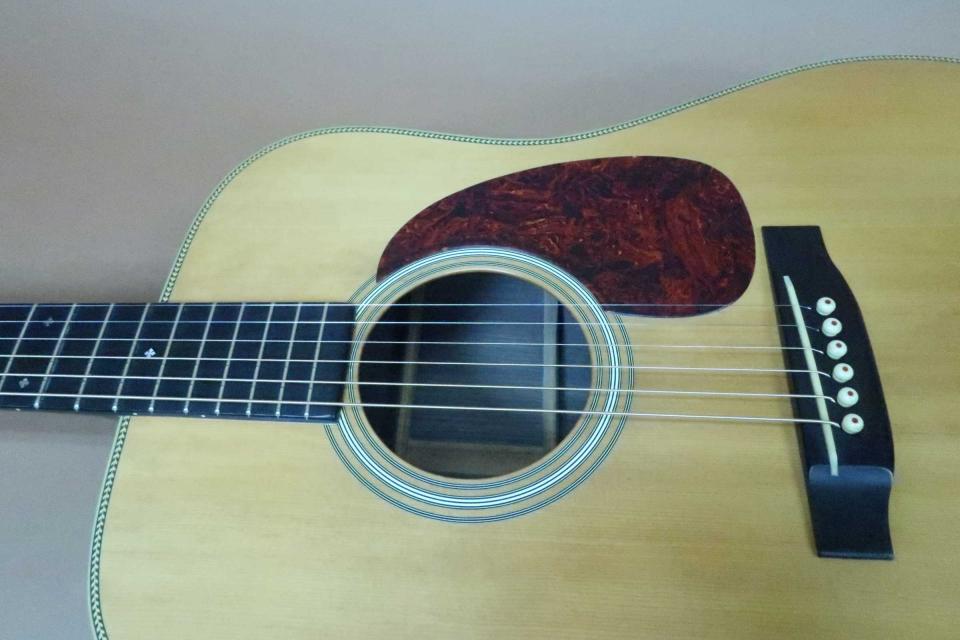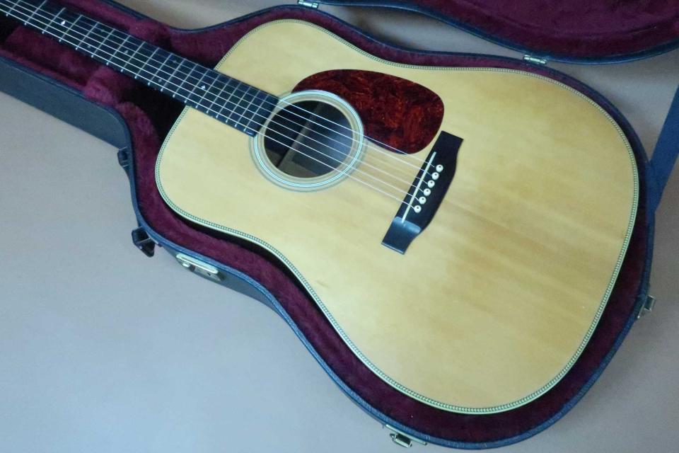 状態は使用感も少なく木部のクラックや修復歴も見受けられません。ただ前所有者の方が、ほろ酔い気分で弾いておられた時にスチームがかかり塗装の劣化が発生したあため、某有名工房にてトップとサイドをヴィンテージスタイルのやや艶を落とした塗装にリフィニッシュされております。しかしバックやネックはオリジナル塗装で、演奏に伴う傷や打コンも少なく木部のクラックなどは見受けられず、ネック裏も綺麗で気になる打コンや擦り傷は見られず、ナロースタイルのVシェープグリップは、手に馴染み演奏性も抜群で問題がありません。ボディ左バックのウエスト辺りのバインディング修理がありますが殆ど分かりません。弦長645,2mm、ナット幅42.9mmのナロースタイルVシェープグリップは物凄く握りやすく手に馴染み弾きやすく、弦高も12F6弦で約2.5mm、1弦約2mm、サドルの余裕も約2,5mmあり、スクエアロッド(SQ)ネックも反りや元起も見受けられずネックを含めプレイヤビリティも良好です。稀少なオリジナル・マーティンハードケース、東海楽器のオーダーシートも付属しています。1930年代のオリジナル・プリウォー D-28は超高額ですが、100万円を切ったお手頃な価格のD-28 ヴィンテージ・スペック/ハカランダ仕様です。是非この機会にご検討を頂ければ幸いです。