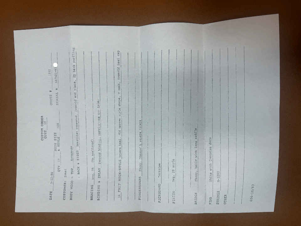 当時のC.FMartinの輸入代理店であった東海楽器のカスタム・オーダーモデル、Martin D-28 CTM Brazilian 1984年製の入荷です。1984年、当時の輸入元だった東海楽器の企画で19本のみ限定生産された1930年代のプリウォー・スタイルのスペックで制作された稀少モデルです。1930年代の戦前モデルを基本ベースにボディートップは良質な杢目の詰まったシトカ・スプルース単板、サイド&バックにはヴィンテージ・マーティンを彷彿とさせる稀少な柾目のブラジリアン・ローズウッド単板、ヘッドにはオールド・スタイル・デカールロゴ、またペグはマイナスネジ留めのヴィンテージスタイル・ウエバリーオープンバック・ペグ、現在では稀少なオールド・ナロースタイル・Vシェープ・マホガニー1ピースネック(42.9mm)、スクエア・ロッド(当時カスタムオーダーのSQネック)、エボニー指板&ブリッジ、ロングサドル、ダイヤモンド・スクエア・インレイ、ヘリンボーン・トリム、アイボロイド・バインディング、稀少なオリジナル・赤ドットのブリッジピン、ベッコウ柄ピックガード、ネックグロックにはカスタムスタンプとシリアルが確認できます。本ギターはマーティン社から送付された当時のオーダーシートも有りカスタムオーダーの初年度シリアルから19本目までのシリアルも確認できます。本ギターも戦前の復刻モデルながら既に生産から41年を経過したリアル・ヴィンテージです。カスタム・ショップの先駆けでもあり、後のオーセンティックにも通ずる細部にまで拘った仕様で、現在では大変貴重な柾目ハカランダを使用し限定19本のカスタム・オーダーモデルです。