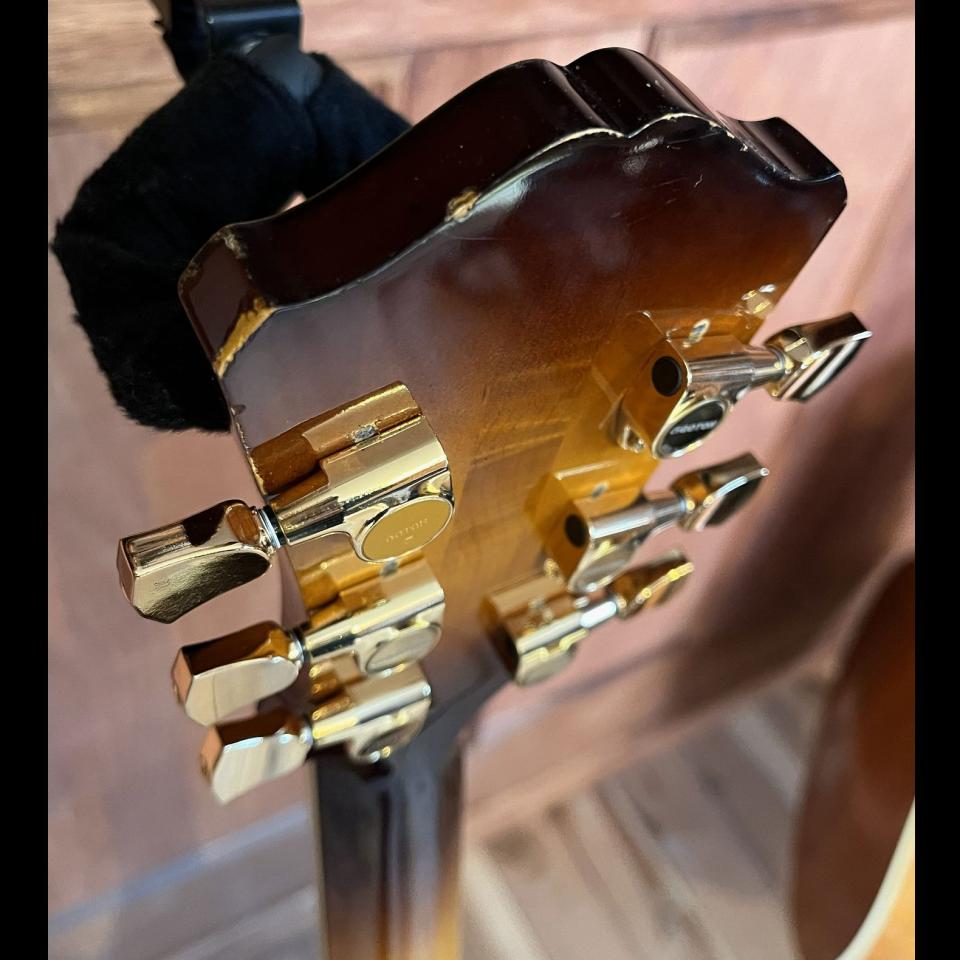 塗装面には小さな塗装欠けや傷が多くありますが、木部へのダメージなどは皆無。ペグ交換歴(ビス穴埋め)跡があり、現在は高性能なGotohのロトマチックが装着されていて、さらに3弦ペグのみ交換されています。
