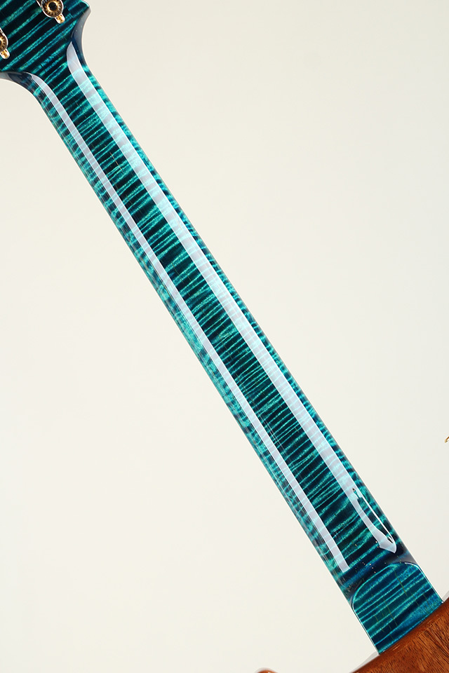 ネック部はボディトップ同様、鮮やかなカラーが目を惹くステインド仕様の "Figured Maple" ネック/ "Ebony" フレットボードのウッドマテリアル。