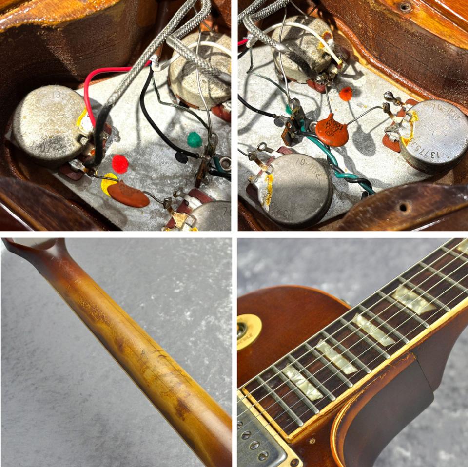 ボディは3ピースメイプルトップに3層マホガニーバック(メイプルを挟んだ通称パンケーキボディ)となり、このあたりの年式にありがちな接着面の剥がれなどは見られません。ネックはメイプルの3ピースとなります。ネックの状態はややS字状の反りがみられます。12F以降のハイポジションでややチリチリビリつきを感じます。ネックジョイントはショートテノン仕様。(中子はフロントピックアップのキャビティからは見えません)