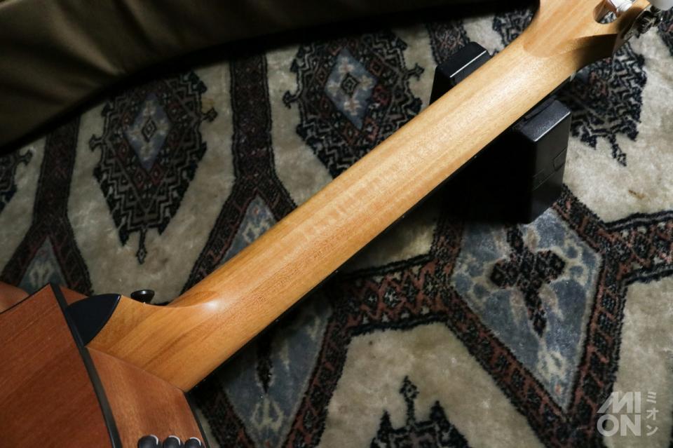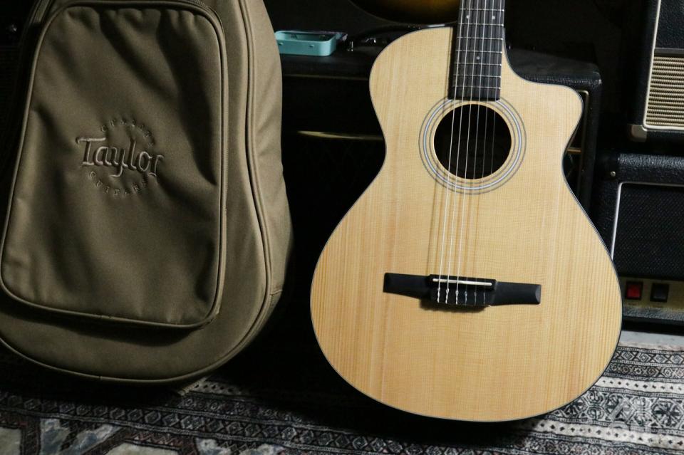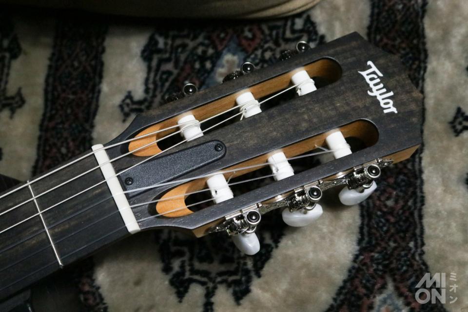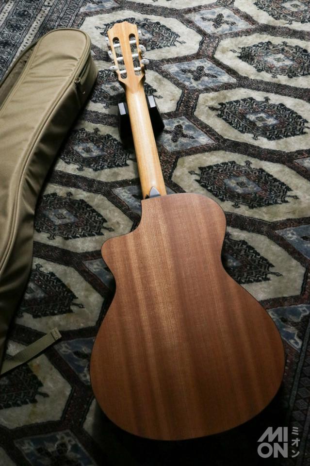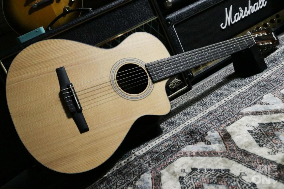 「112ce-N」はテイラーでは初の100シリーズをベースにした、GC (グランドコンサート)サイズのナイロン弦ギター(エレガット)モデルです。約47.6mmと、細めなナット幅と低めにセッティングされた弦高による弾き易さが、長所となっています。