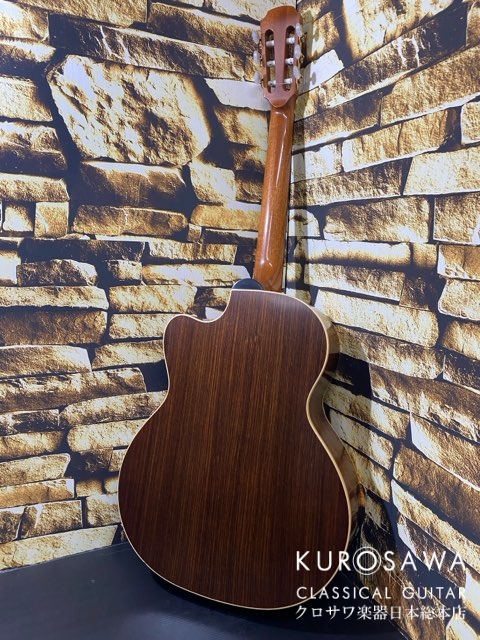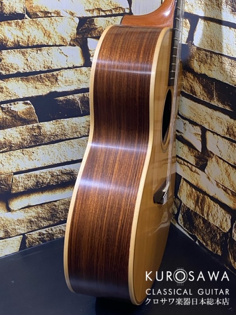 今回入荷のモデルは2003年から2004年にかけてアイルランドで製作された非常に珍しいジャズナイロンシリーズ、Taylorなどに見られる16インチ幅のグランドオーディトリアムボディにカッタウェイ仕様。