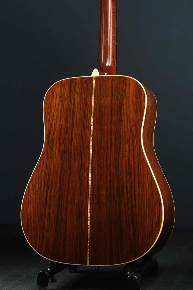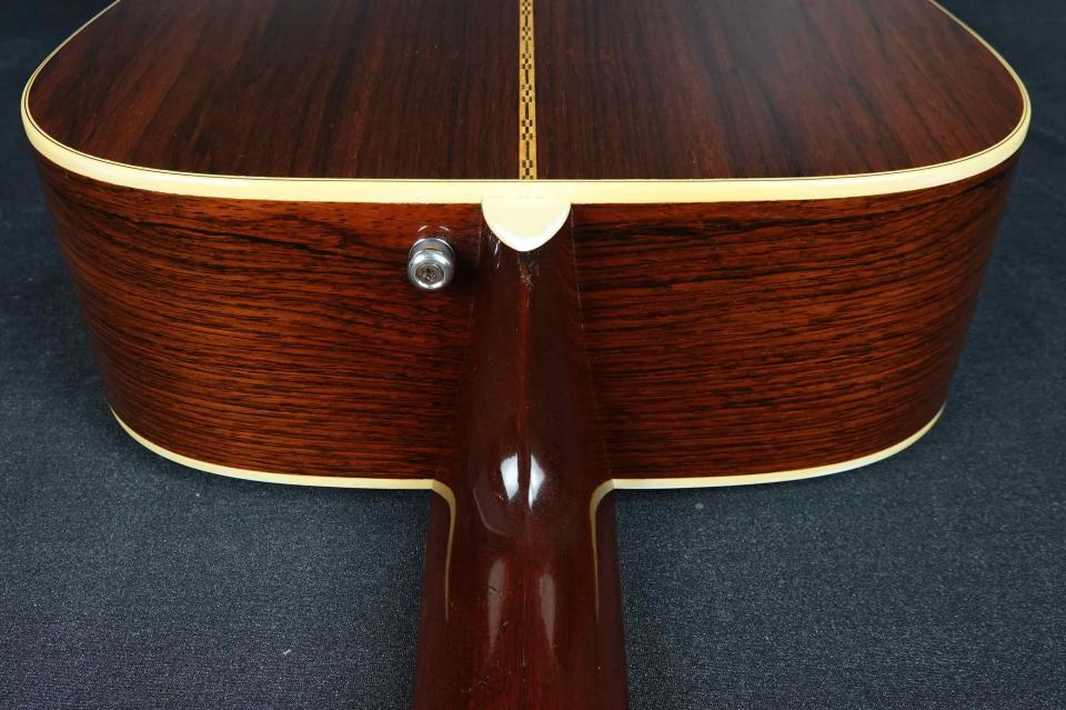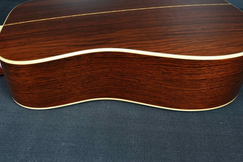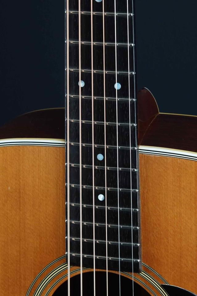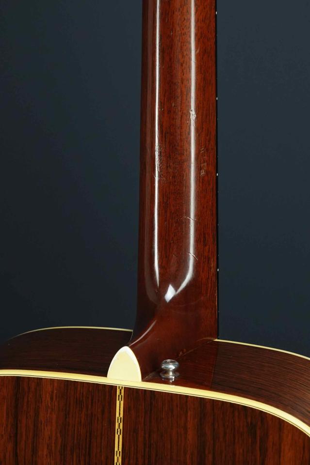 赤黒く色の良いハカランダで、60年代D-28としては最上質の材が使われています。ボディの薄いラッカー塗装も、光沢があり雰囲気抜群です。