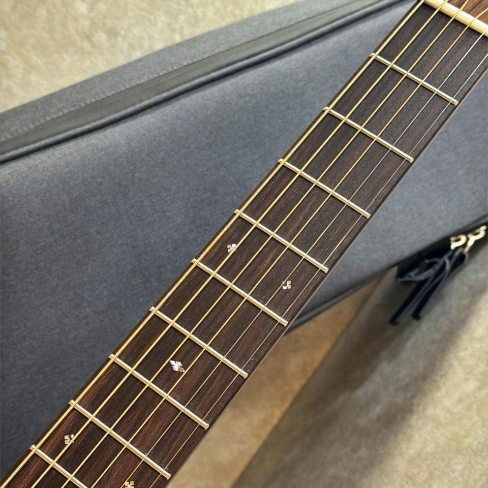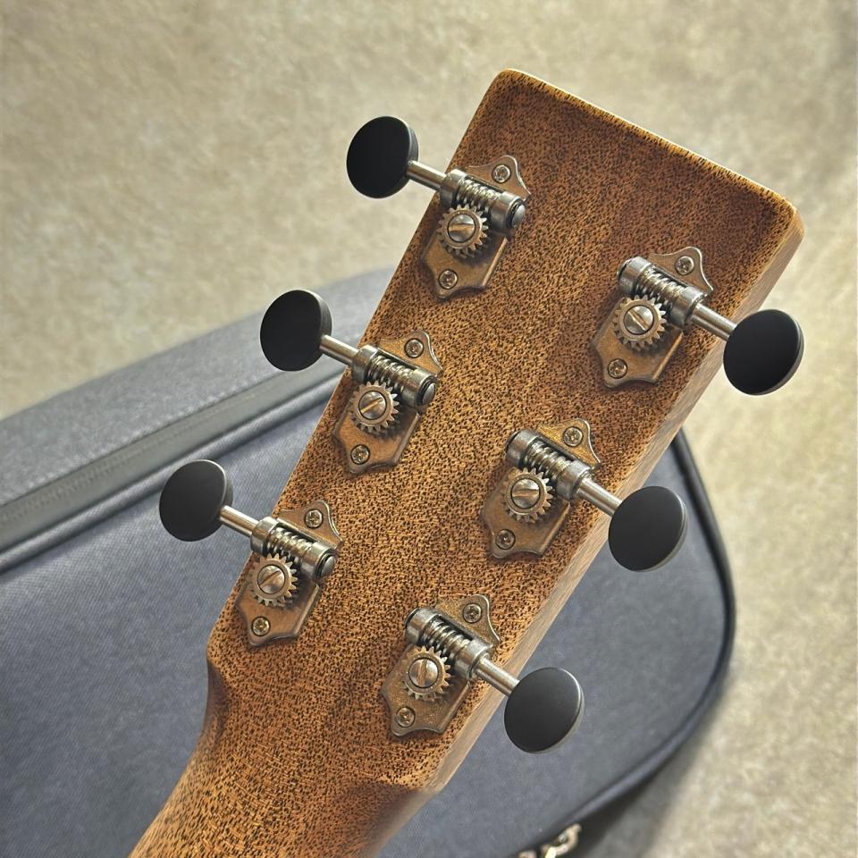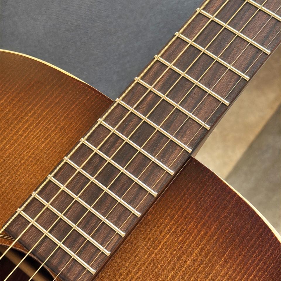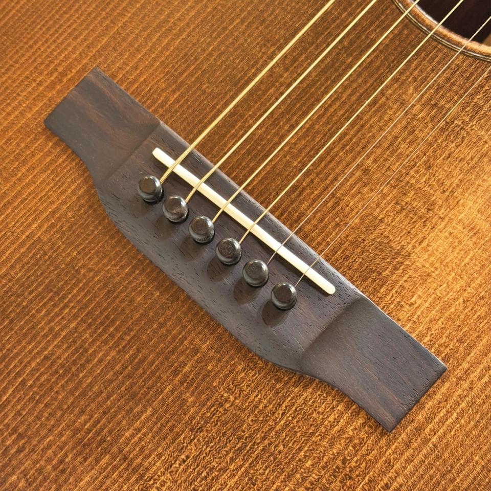 オールマホガニー・ボディならではの乾いたレスポンスと、芯のある中域は000サイズとの相性も良く、フィンガースタイルからストロークまで幅広く対応。