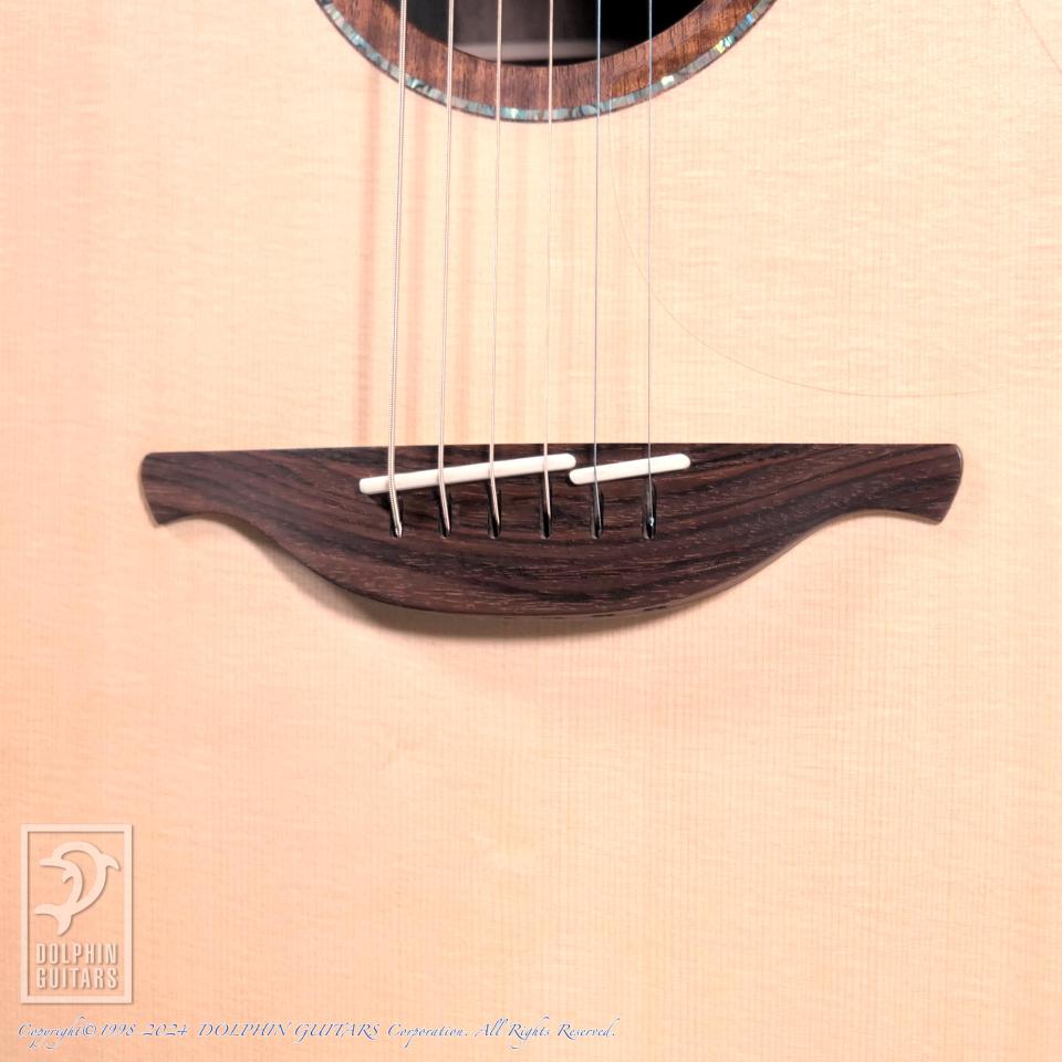 シルキーなアルパインスプルースと迫力の杢が映えるマダガスカルローズによる上位機種。トップボードの見た目の通り、美しくしなやかなサウンドにうっとりします。圧倒的に音像の大きなマダガスカルローズの特徴は、大型ボディも相まってどこまでも深く強く響きます。そのたっぷりとした響きは、オープンチューニングを使用するギタリストに多く受け入れられている最大の理由でしょう。柔らかいテンション、低い弦高設定による高い演奏性、ピッチの安定性も抜群です。