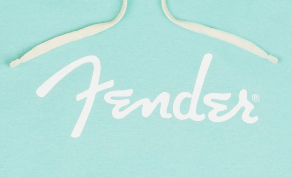 Fenderのスパゲティロゴをあしらった心地よいダフネブルーのフーディーは、ストリートからスタジオまで、あらゆるシーンで活躍します。