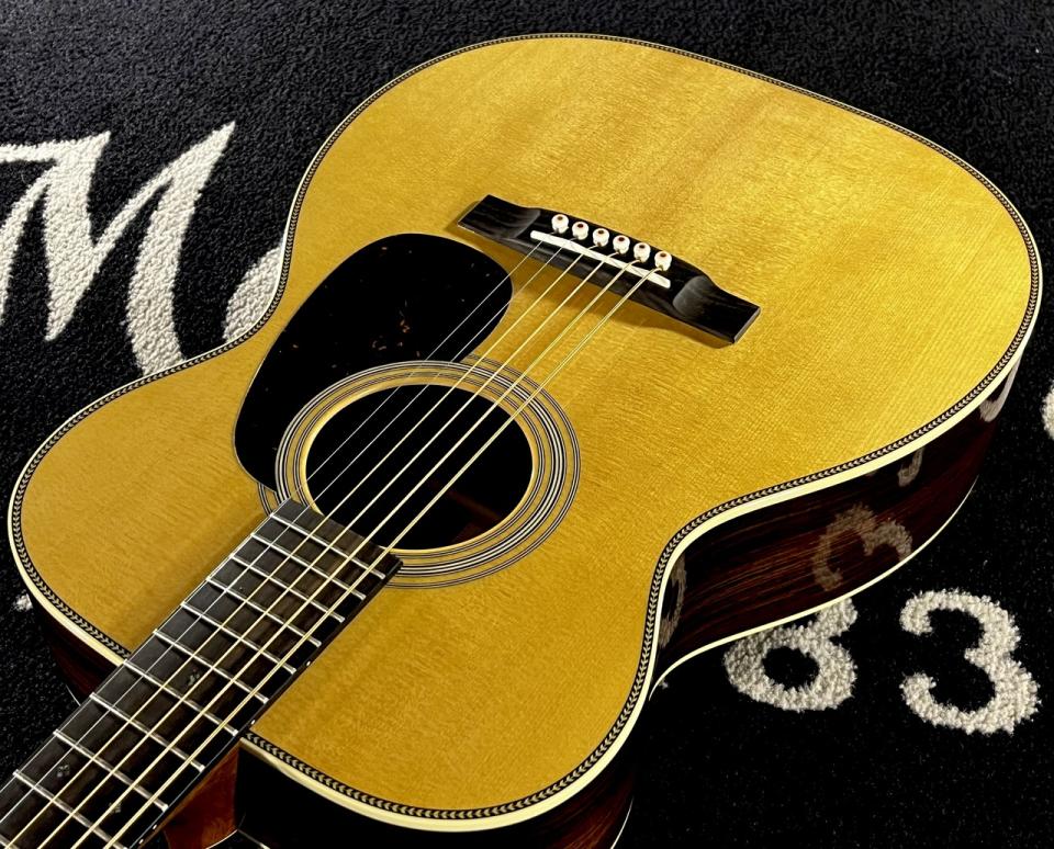 トップにはシトカ・スプルース単板、サイド&バックにはインディアン・ローズウッド単板を使用し、スキャロップドXブレイシングによって、コンパクトなボディながら豊かな響きと優れたレスポンスを実現しています。ボディサイズは00(ダブル・オー)で、ロウアーバウトは約14 5/16インチ(約364mm)。一見するとぱっと見の違いを感じにくい000-28のサイズ(約15インチ、約381mm)と比べますと、実寸で約17mmほど幅が狭く、厚みも最大約105mm前後と、000サイズ(約108mm前後)よりわずかにスリムなモデルです。その恩恵は何より抱えた際の収まりの良さに現れます。