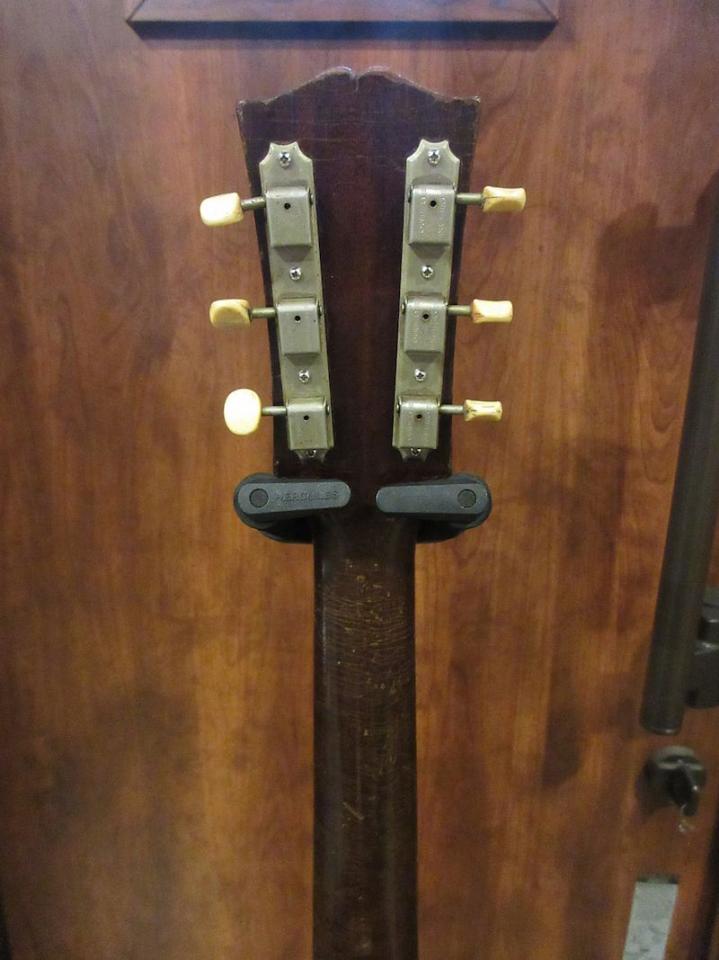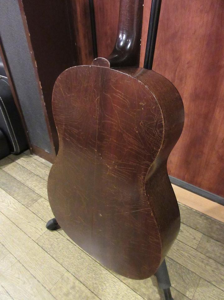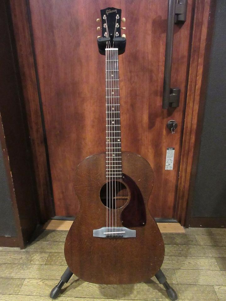 L-00モデルを始祖とするLGモデルは1942年に誕生し、1947年に発表されたLG-1に続き、兄弟モデルの末っ子として1958年に登場したのがLG-0です。発売当初から変わることなくオールマホガニーボディーのスペックで製作され、1970年代初頭まで生産が続けられました。ブレイシングはLG-1同様ラダーブレイシングが採用されており、クラシックギターとほぼ同じサイズのボディーは抱えやすく、音量はそれほど大きくはありませんがVintage Gibsonの音色が手軽に味わえるモデルとして昔から人気の高いモデルです。本機は1964年製、レギュラーネック最終期にあたるモデルで、ブリッジはプラスティックブリッジ。ボディー全体にびっしりウェザーチェックが入った貫禄のルックス。ナットが交換済で、ボディーバックに1箇所クラックがあり(裏側からクリートが打たれ、きちんと修理されております)ブリッジ下にふくらみは見られますが、12フレット上の弦高は6弦で2.4mm、1弦で1.9mmと弾きやすくセットアップされております。乾いたトーンでありながらも太さがあり、ポロポロと爪弾くにはモッテコイの1本♪レギュラーネックにプラスティックブリッジの組み合わせはLG-0でも人気の高い組み合わせ、一度お試しいただきたいヴィンテージスモールギブソンです!ハードケース付属。