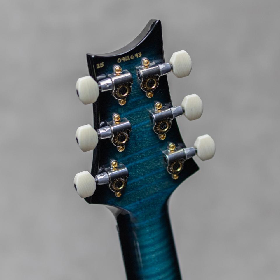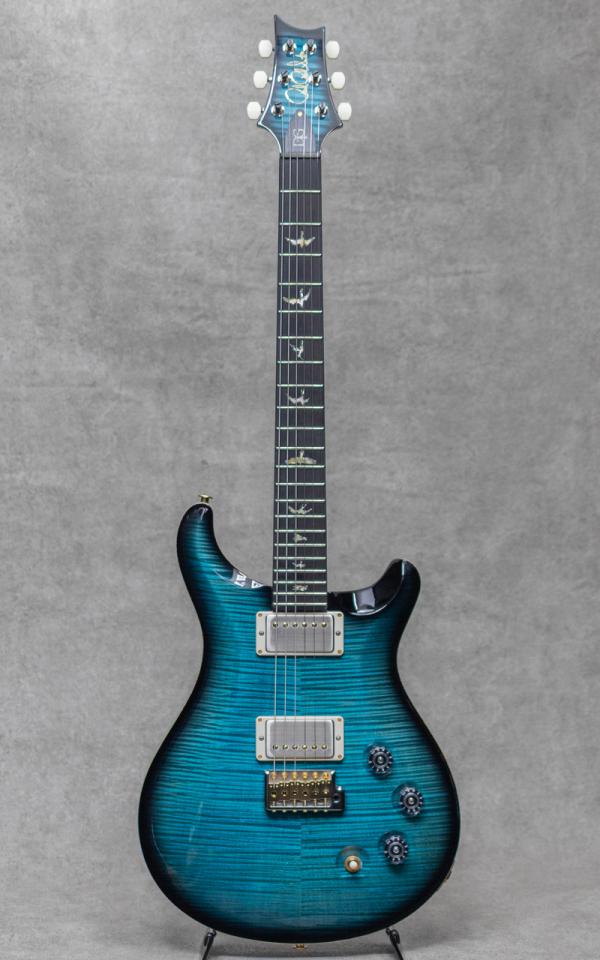 "DGT(David Grissom Trem)"は、長年PRSの製品開発において創業者"Paul Reed Smith"の厚い信頼のもと、多大な影響を与えてきたギタリスト"David Grissom(デイビッド・グリッソム)"の理想を実現した実戦向け実力派モデル。"McCarty"を元としてオリジナルのネックシェイプ、オリジナルピックアップを開発。2008年に登場した後、その完成度は大きく評価されPRSを代表するモデルの1つとなりました。本器は高品質な木材を有するオーダープログラム"Wood Library"にて三木楽器200周年を記念して弊社よりオーダーをした"Miki 200th Anniv. Wood Library DGT"。新カラーの”Sub Zero Smokeburst”をトップにあしらい、ネックはメイプルの杢を美しく際立たせたせる鮮やかなブルーのステイン仕上げ、ボディバック、ネックとヘッドストックのアウトラインはブラックで統一感を持たせ凛としたクールなルックス。Artist Gradeフレイムメイプルトップ、マホガニーバック、フィギュアドメイプルネック、エボニー指板、J-Birdsインレイ、Gen II PRSトレモロ、Phase IIIロッキングチューナー、DGTピックアップを搭載。しっかりとしたグリップ感を持ちつつ吸い付くようなフィーリングのネックシェイプは25インチスケールとも抜群の相性。特徴的な背の高いフレットに加え本器ではメイプルネック、エボニー指板を採用し、より明瞭でクリアな音像も魅力。豊かな倍音を含み甘い飽和感が心地よく、それでいてワイドレンジなピックアップのチューニングも抜群で、レンスポンスに優れタイトに引き締まった本体のポテンシャルとも相まって、バーサタイルに高いクオリティを魅せつけてくれる完成度。トラッドな空気感をしっかりと持ちつつ、あらゆるシチュエーションにおいて卓越した対応力で欲しいトーンを引き出してくれるモダンな演奏性を併せ持った、まさにPRSの醍醐味ともいえる実力派モデルの1本。ぜひご検討ください。