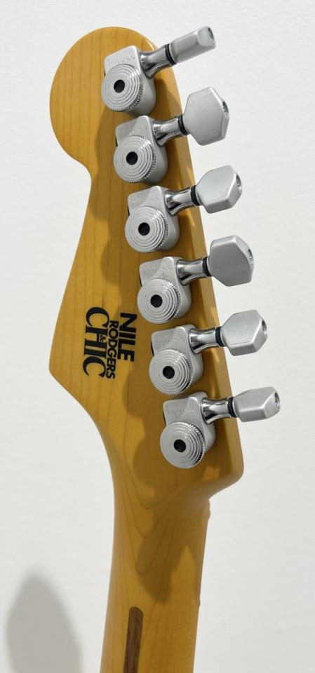 ヘッドストックの背面には「Nile Rodgers & Chic」のロゴがあしらわれ、ネックプレートにはHitmakerのロゴが刻印されています。