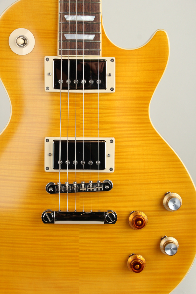 派手で鮮やかな杢目が出たメイプルトップ、経年によりLes Paul Model のデカールが剥がれ Gibson ロゴのみとなったヘッド、年代違いのトップハットノブとメタルハットノブを組み合わせたコントロールノブといった特徴的なルックスはもちろん、フロントピックアップのマグネットが反転されており、ミックスポジション時にフェイズアウトサウンドが出力されるなど、"Greeny" を再現するうえで欠かせない強力な個性を忠実に再現しております。