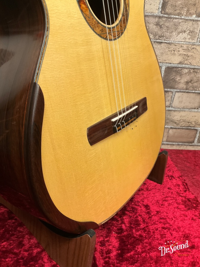 ロゼッタとヘッドにはブランドのトレードマークともいえる特徴的な木目のAmboyana Burl があしらわれ、さらにブランドラベルは高級家具を思わせるような木製のものが使用されています。ギター内部の構造もまた「アーチ」や「箱舟」をイメージさせるもので、完全にシンメトリーな扇状力木とサウンドホール内側上下の特徴的なのハーモニックバー、計算された高さと形状に設定された力木。ほんの僅かにこちらもアーチ型となっている表面板と裏板等々、多くのギターファンを惹きつけてきたスタイリッシュな意匠は健在です。