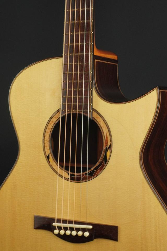 印象的なロゼッタは、バーズアイメイプルのリングに、美しココボロ、フィギャードのコア、エボニー、ウォルナット、明るいイエローのパウアマレロ(別名イエローハート)という珍しいミカン科の木を使ったり、細かなウッドピースが、秋の紅葉のように散りばめられています。