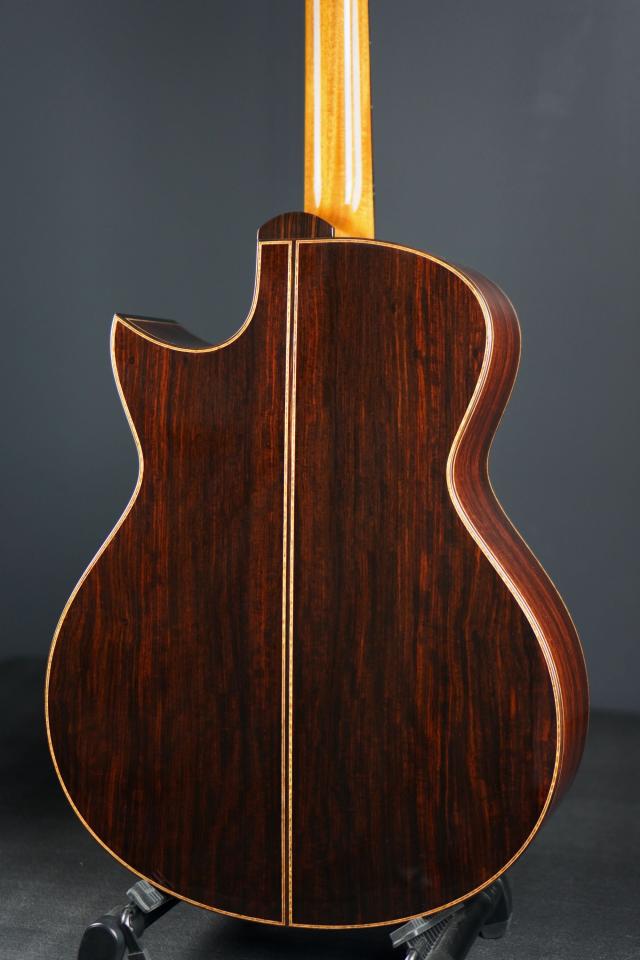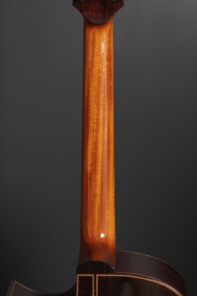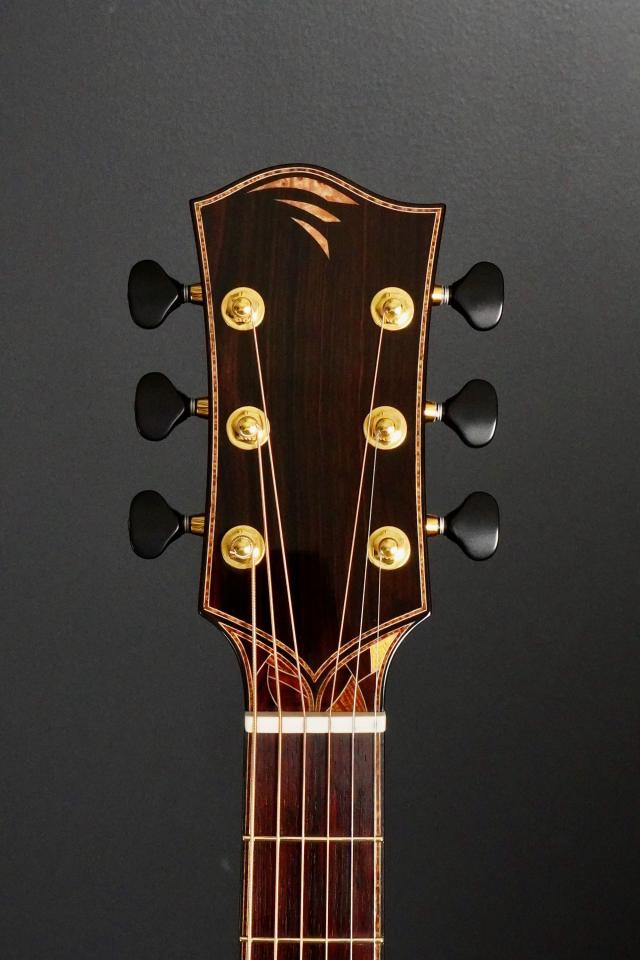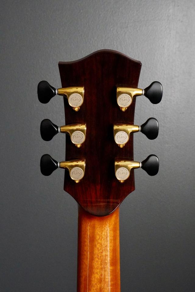 ヘッドや指板、ボディのトップパーフリング、サイドバックまで、フィギャードコアを使ったウッドパーフリングが全体を縁取って、細部までとても精巧な、美しい楽器です。