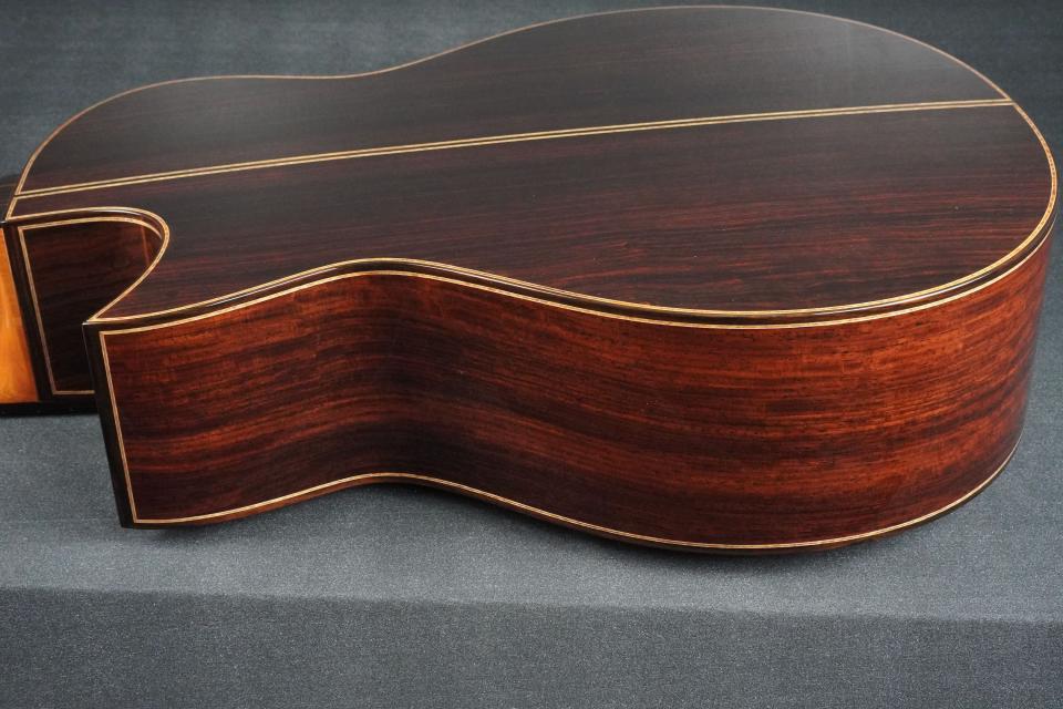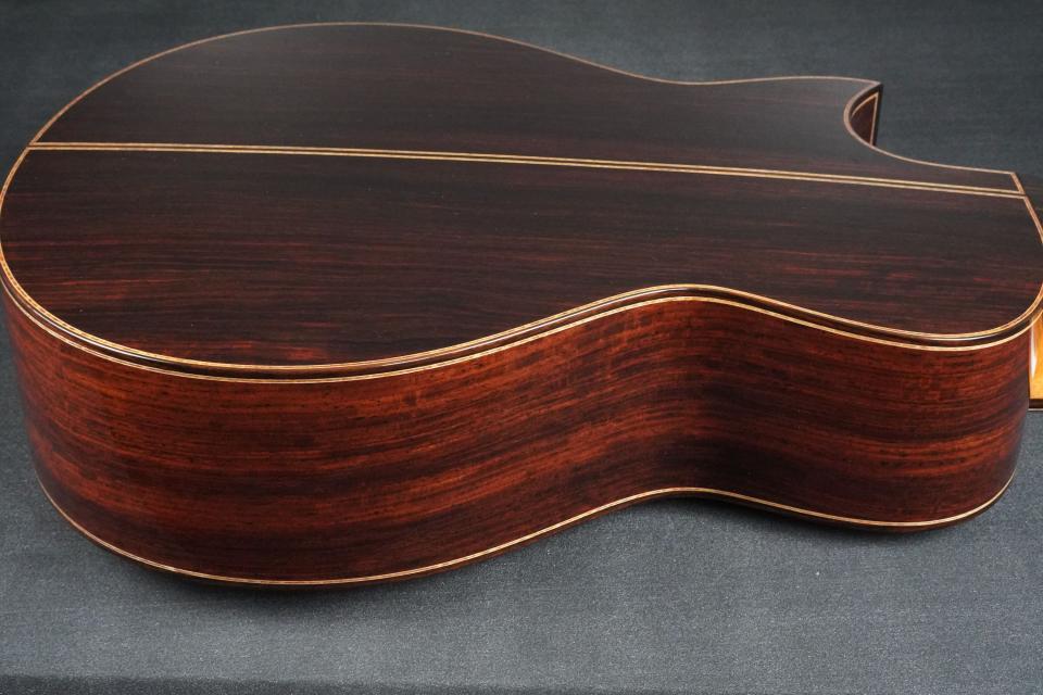 サイド&バック材はココボロで、黒いダークなラインと、赤褐色のコントラストの色合いが美しく、照明を浴びるとタイル模様のように細かくフィギャードが走ります。とても密度が濃く、光沢感のあるエキゾチックなルックスです。
