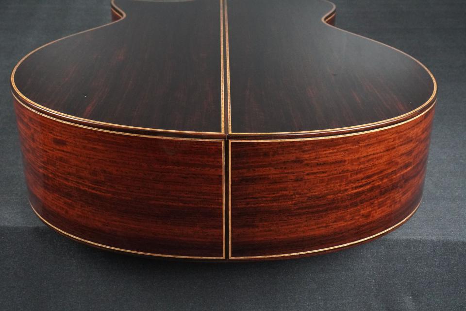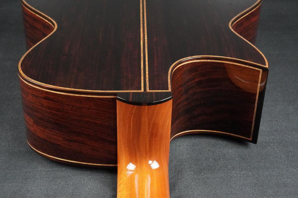 サウンドホールからボディの中を観察すると、独特のネックブロックの立体的で美しい仕上げや、トリプルレイヤーのサイドと、切れ目のないソリッド・ライニング。