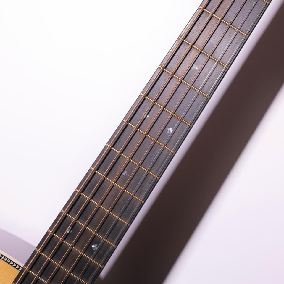 サウンドの核となるトップ材には、ヴィンテージ・トーン・システム(VTS)によってエイジング処理が施されたスプルースが用いられています。時間を経た木材のような響きを持ち、鳴らし始めから深みと広がりを感じさせてくれるのが特徴です。さらに、アディロンダックのVTSフォワードシフト・スキャロップドXブレーシングが採用され、音の立ち上がりは極めて俊敏で、繊細なピッキングにも力強いストロークにも豊かな反応を示します。ブリッジプレートにはカーボンファイバーが組み込まれ、強度と軽量性を両立しながら音の伝導効率を高め、持続する響きを支えています。また、ブリッジピンにはリキッドメタル素材が用いられており、余計なエネルギーロスを抑えることで、粒立ちの良い明瞭なサウンドを実現しています。これらの工夫が、伝統的なドレッドノートらしい迫力ある低音と、現代的なクリアさを兼ね備えたサウンドバランスを生み出しているのです。