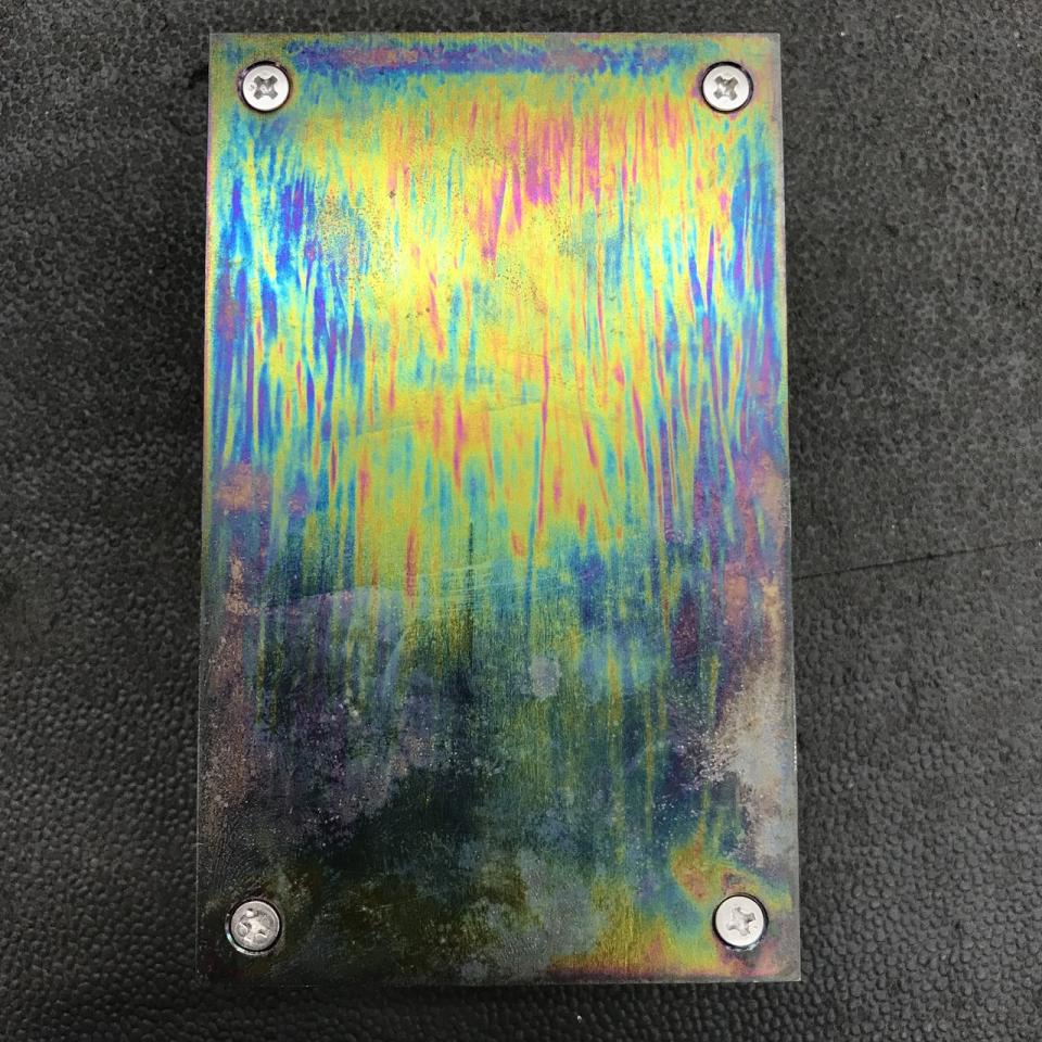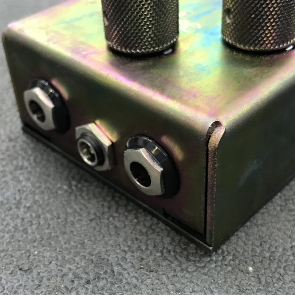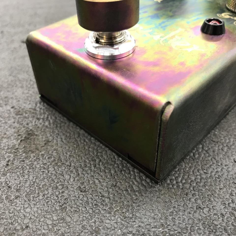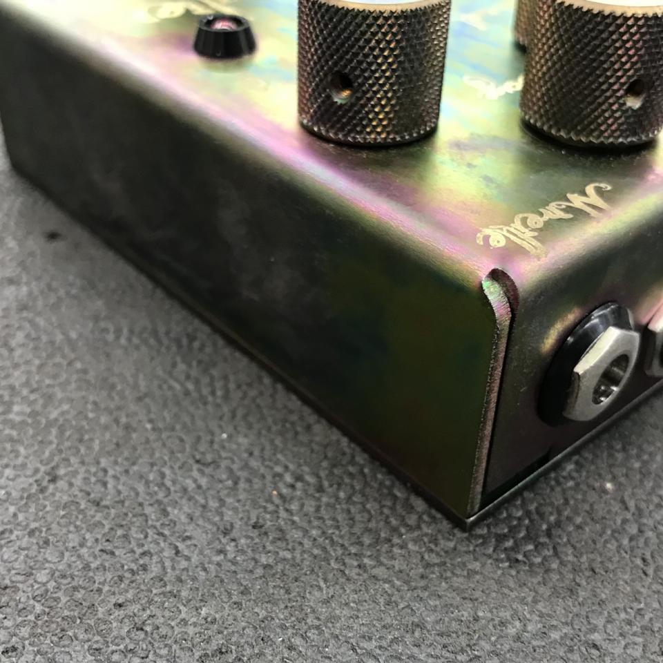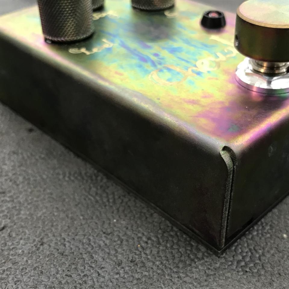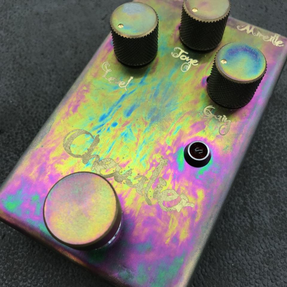 HATA(畑精密工業株式会社)が製作した、世界で初とも言われる鮮やかな仕上げ処理【虹メッキ仕上げ】の筐体を使用したオーバードライブ「シュバリエ」。