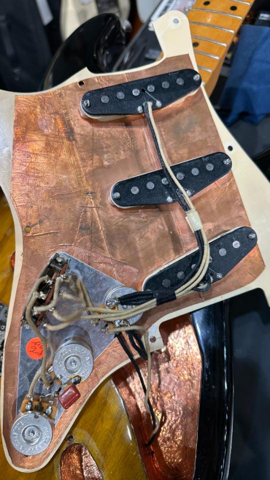 ピックガード裏とボディキャビティ内部にシングルコイルピックアップ特有のノイズを軽減するため、銅箔によるシールド処理が施されております。