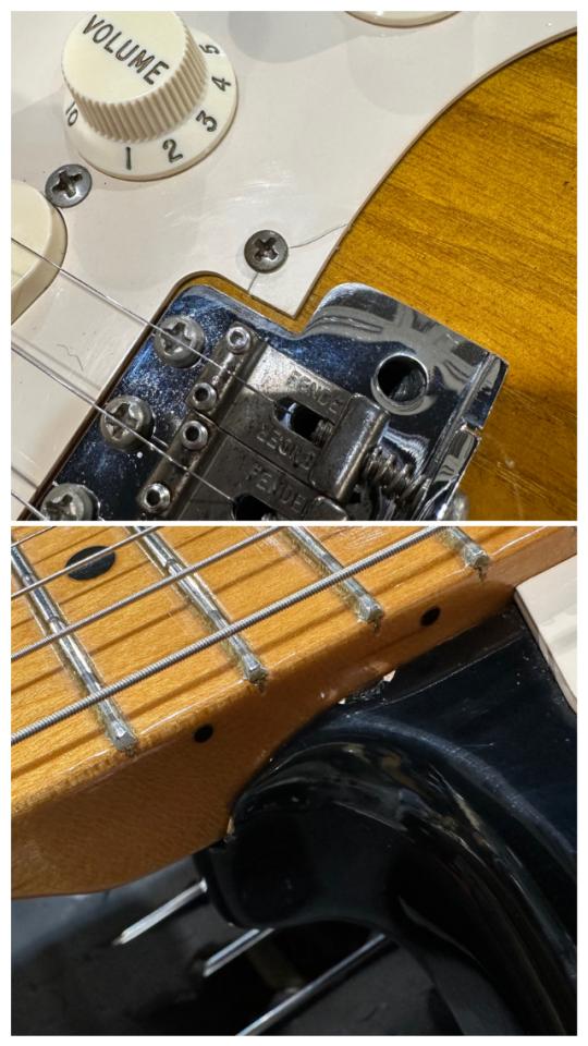 状態といたしましては、ヘッドサイドのネックハンガー位置に塗膜の色移りあり、ボディへのキズや打痕、塗装クラック、ネックジョイント部の塗装チップなど多少の経年感は見られますが、外観を大きく損なうようなダメージはございません。ピックガード、バックパネルの割れなどはございますが、ヘッドデカールの剥がれも無く良好なコンディションをキープしております。