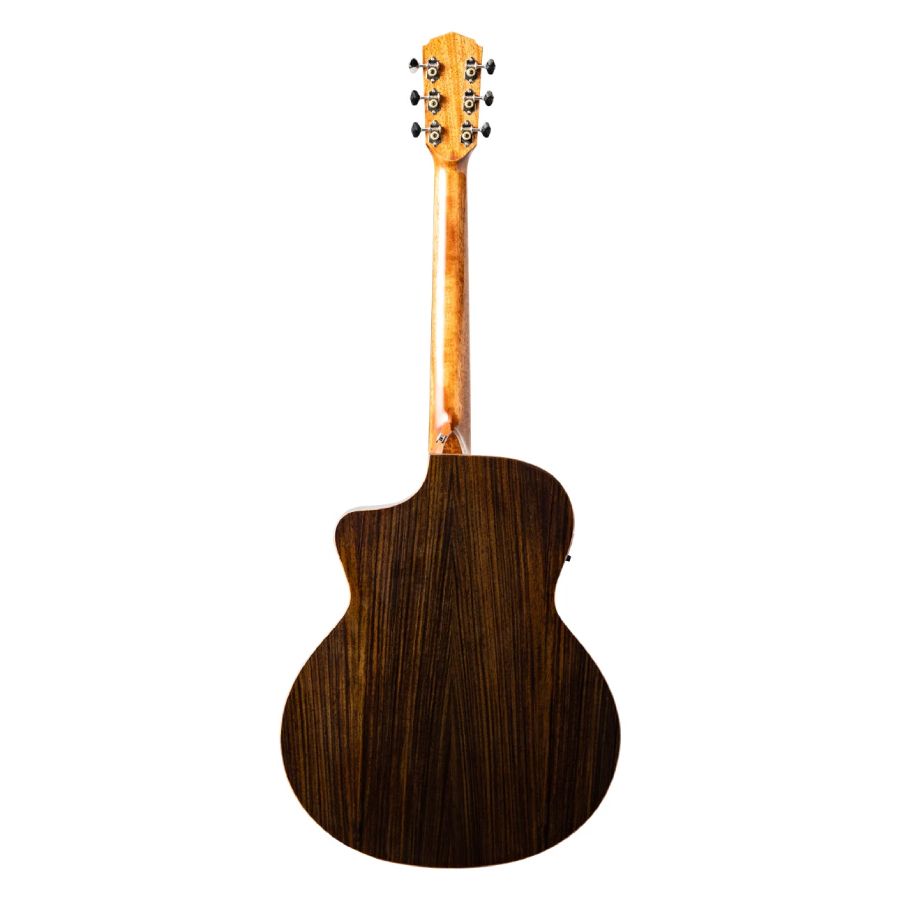 トップはスプルース単板。サイドバックはインディアンローズウッド。ボディコンター加?に加えてカッタウェイ、ピックアップ付きであらゆるプレイスタイルにマッチします。