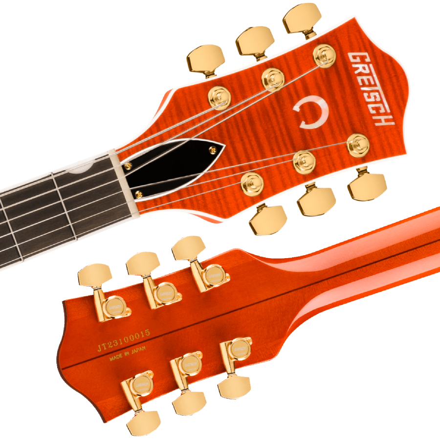 その他、ピン留めエボニーベースのAdjusto-Maticブリッジ付きストリングスルーBigsby B6GPヴィブラート、Graph Tech TUSQ XLナット、Gotohロッキングチューナー&ストラップロックといったプレミアムな特徴を備えています。デラックスハードケースが付属します。