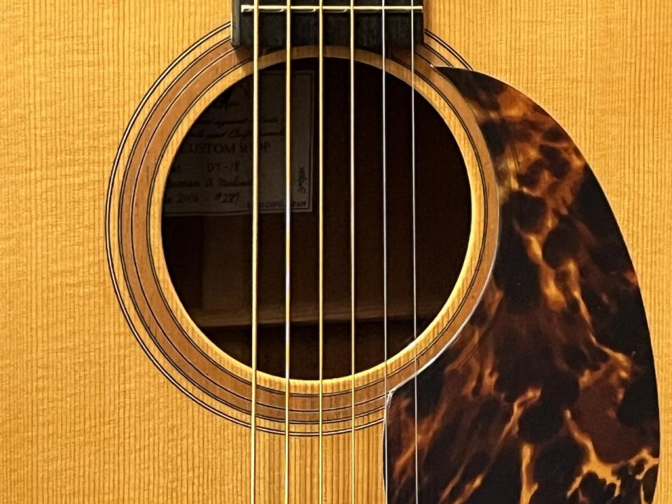 ヤイリギターDY-18の基本仕様はそのままで、ボディバインディング及びロゼッタにも木材を使用するなど、レギュラー品とは異なるカスタムショップならではの拘りが入っております。