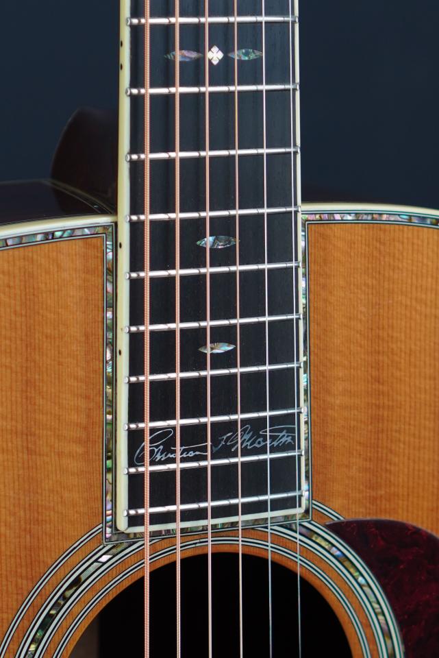 指板の19フレットに、C.F. Martinのシグネチャーのインレイが施されているのも特徴です。