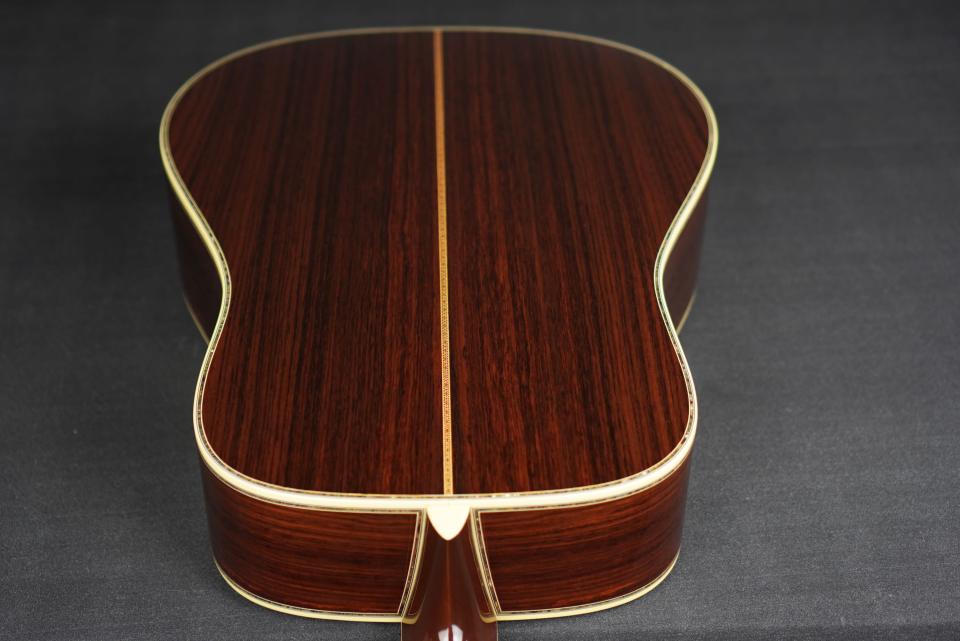 色の濃いサイドバックには、アバロンボーダーの色鮮やかな七色の輝きが、D-45ならではの豪華さを感じさせてくれます。