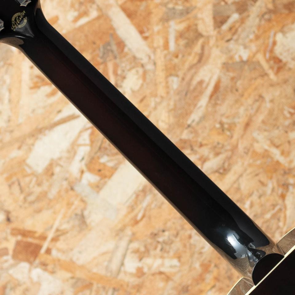 1942年よりJ-45と共に産声をあげ、J-45を14 1/8インチまでダウンサイジングした定番モデル”LG-2”。62年頃にはマイナーチェンジモデルとして”B-25”が登場しました。大きな違いとしてはADJサドルの採用、ラージガードが挙げられます。LGと共にスモールギブソンを代表する機種です。本機は1960年代のスペックをインスパイア、”B-25 ADJ AN”弊社オーダーモデルの1本。スプルーストップ、マホガニーサイド&バック、ローズウッド指板&ブリッジ、べっこう柄ラージピックガード、アジャスタブルサドル、43.8mmナット幅のレギュラーネック仕様。取り回しの良いサイズ感。ガランとした空気感の強いサウンド、金属的な高音と立ち上がりの鋭さ、切れ味の良い響きはアジャスタブルサドルならではの音色です。肩肘張らずにリビングでラフに弾ける1本としても、小柄な方が圧迫感なく弾けるギターとしても重宝する1本。オリジナルハードケース付属。
