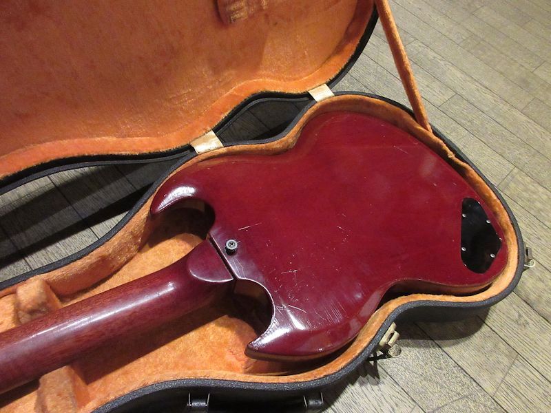 1952年誕生したレスポールモデル、1961年にボディーシェイプがSGシェイプへと変更され、エンドース契約の終了と共に「SG」へと名称が変更されます。本機は1962年製、ヘッドに50年代から続く「Les Paul Junior」のシルクスクリーンロゴが施された最後の年式の価値あるモデル!マホガニーボディー&ネック、縞目の美しいブラジリアンローズウッド指板にドッグイヤータイプのP-90をマウントしたこのモデルは、クリーンではハリのあるウッディーなトーン、歪ませるとザクザクとパワフルなサウンドを生み出すロックンロールマシーンとして古今東西人気のモデルです。チューナーと、経年により歪みが生じ割れやすいピックガードが雰囲気の良いリプロダクションパーツに交換されておりますが、アッセンブリはオリジナルをキープしており、フレット・ナット交換済でプレイアビリティーも抜群に良い個体。SGの弱点でもあるジョイント部やジャック部のリペア等もなく、はじけるような強烈なサウンドが弾き手を虜にするイチオシの1本です!ウェイトも軽量は2.84kg、貴重なイエローインナーオリジナルハードケース付属。
