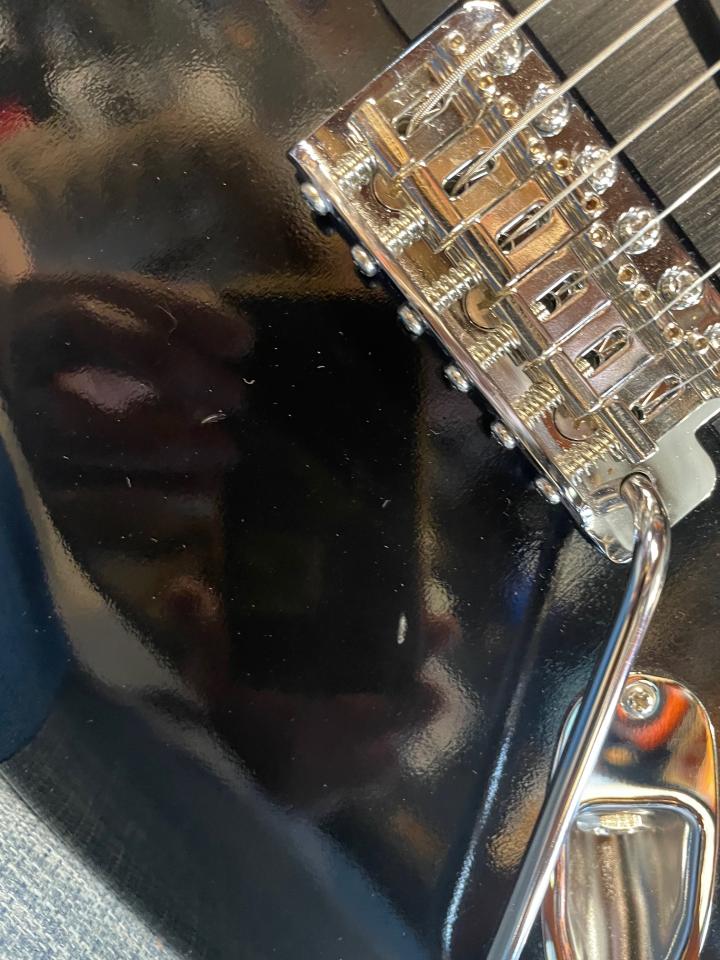ブラックのシンラッカー仕上げのボディーはアルダー3Pで、ブリッジはオーソドックスなシンクロトレモロを採用し、オーソドックスなストラトでありながら生の鳴りをころさない仕上がりになってます。