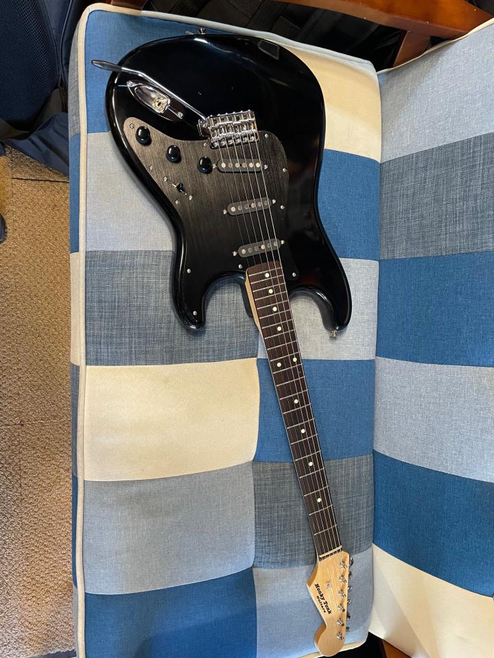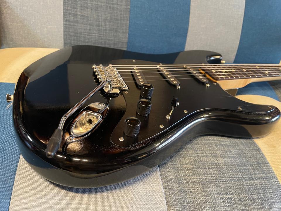 ブラック・ボディにブラックのアノダイズドアルミピックガードを合わせたSTスタイルです。
