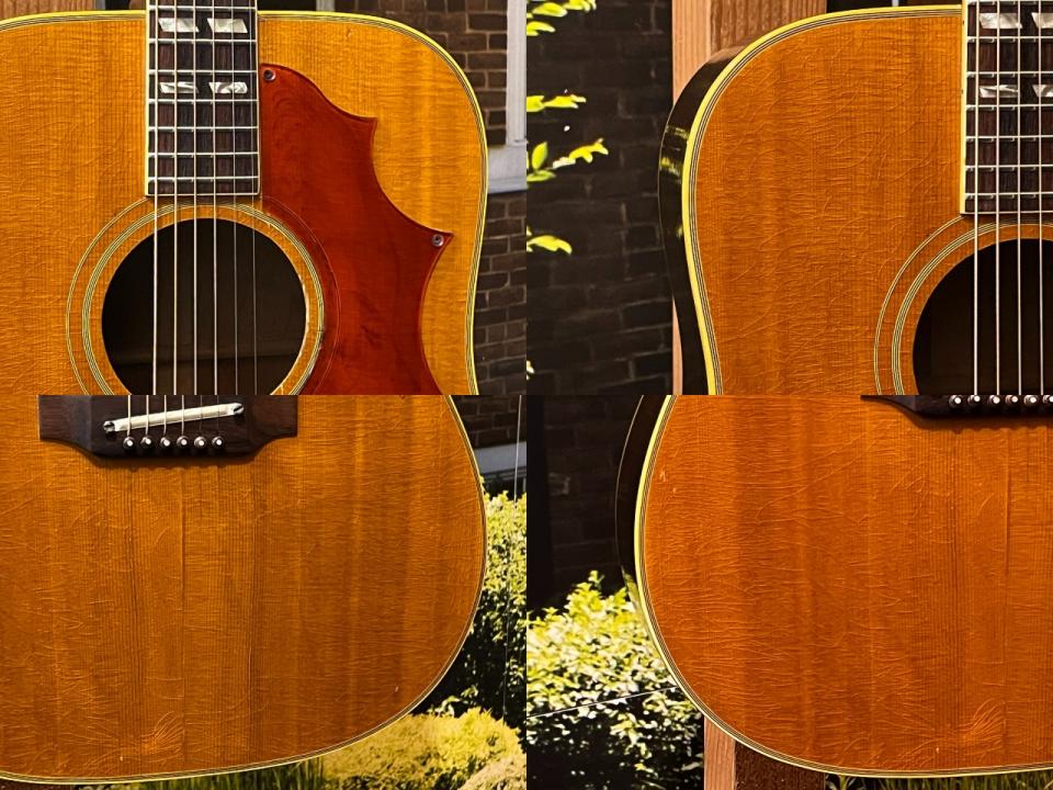 Country WesternはSouthern Jumboのナチュラルバージョンとなり、本器は1969年製の個体、スプルースTOP、マホガニーSIDE&BACK、スクエアショルダーボディ、ナット幅約42mm、厚めのピックガードはこの時代の特徴とも言えるビス留めされたタイプのものとなります。アジャスタブルサドル、クラウンインレイ、ダブルパラレログラム指板インレイなど上位機種ならではの外観も圧倒的な1本です。