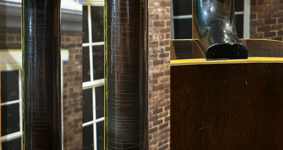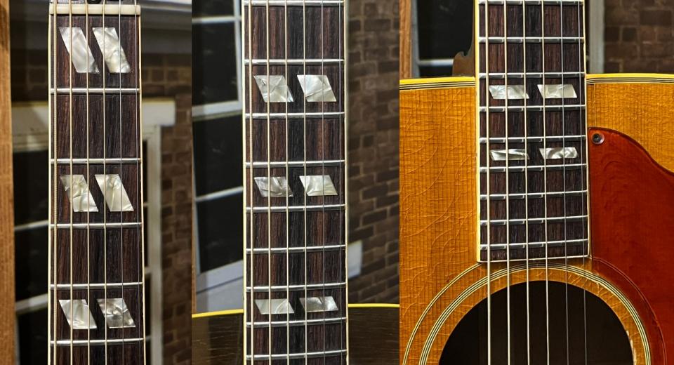 気になるサウンドは、スクエアショルダーボディの力強い鳴り、アジャスタブルサドル特有の歯切れの良さもありジャッキっとしたサウンドも分離良く、各所に補修歴などございますが、時代と共に弾き込まれ、今現代に辿り着いた希少なGibsonギターです。