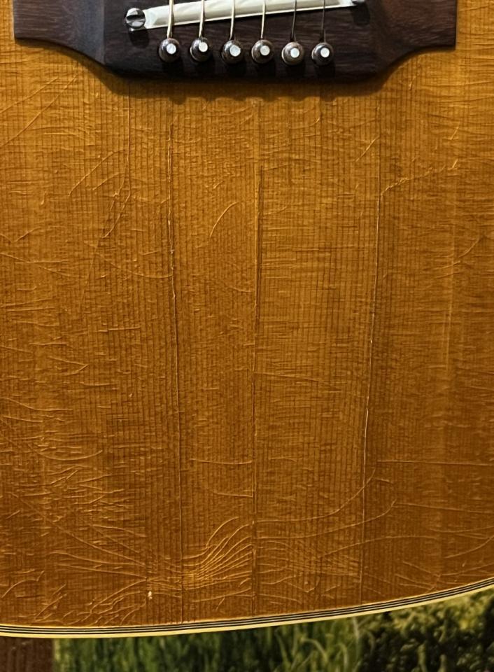 状態は経年使用による傷関係、ウェザーチェックは散見され、トップ板ブリッジ下部には大きな割れ補修あり(パッチ止めあり)、その他指板脇ピックガード下に割れあり、ネックとボディの結合部(ボディを正面から見ると14フレットジョイント右側部分)に一部変形が見受けられます。現状ネック状態は大きな反りなど無く、演奏性は良好、現在の弦高は6弦側約2.7mm 1弦側約2.2mmとなります。ナット、ペグ交換あり。