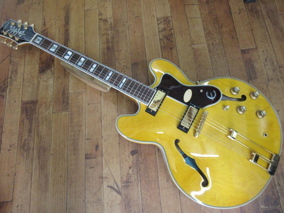 レイヤード・メイプルから作られたセミホローボディが採用され、ハウリングに強いメイプルセンターブロックを備えています。22フレット仕様のマホガニー・ネックはバインディング仕様で仕上げられ、インディアンローレル指板上ではアバロン素材によるトライアングル・インレイとマザーオブパール素材のブロック・インレイが施されています。バインディング付きのヘッドストックには、歴史的なエピフォンのロゴとマザーオブパールの ”ツリー・オブ・ライフ” のデザインが施されています。
