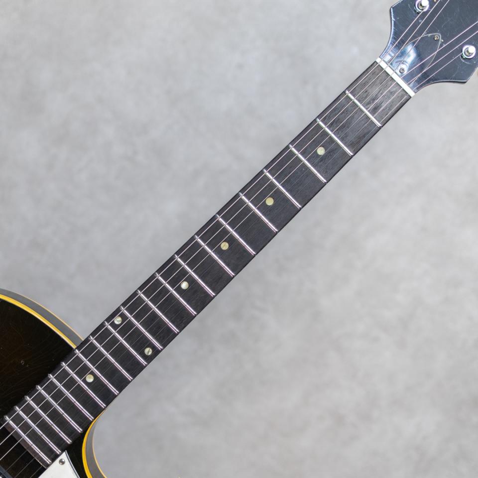 本器は Gibson Kalamazoo工場1961年製 E452TD"Sorrento" 。フルアコースティック仕様のシンボディにシングルカッタウェイを持ち "Gibson ES-125TDC" とほぼ同一の構造ですが、ミニハムバッカー2機を搭載、125とはまた一味違ったトーンをお楽しみいただけます。"Royal Olive" カラーが程よく退色し、ボディに刻まれたチェッキングと共に、非常に良い雰囲気を持っております。まさに61年らしい平らなネックシェイプは約42㎜の黄金期のナット幅を持ちつつ、パッと握りやすいプレイヤビリティ。またこの身軽なネック特有の明るい響き、軽快さも面白いほどにキャラクターとして活きて感じられます。ボディのトーンも乾いた空気感が説得力を持った魅力的なヴィンテージフィール。ステッカードナンバード・ミニハムバッカーによる素早くも厚みのあるアウトプットは、本体の枯れたニュアンスとのマッチングも抜群。こちらナット、ペグ、ブリッジ、ノブは交換済み。フレットは6割ほどと低くはなっているものの、各ポジション音詰まりなどなく気持ちよく演奏可能です。その他、雰囲気を損なうような顕著なダメージも見受けられず良好な外観をキープ。即戦力のライブギアとしても、ご自宅でポロポロとつま弾くカウチギターとしても魅力的な一本。ぜひご検討くださいませ。ハードケースが付属。