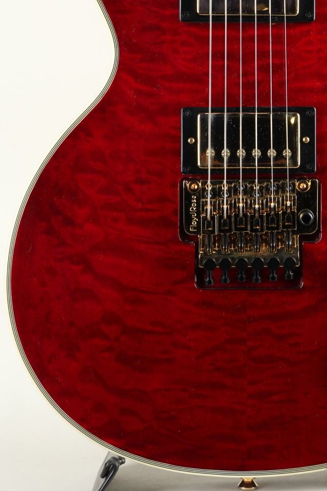ド派手な杢目が出たキルトメイプルをトップに採用したゴージャスなルックスが特徴的な一本。ギブソンからリリースされている"Les Paul Axcess"のEpiphoneバージョンともいえる当モデルは、ハイポジションの演奏性が格段に向上するネックジョイント部のヒールカット加工やボディバックのコンター加工など、プレイアビリティ面に直結したモダンスペックをはじめとして、レスポールへの採用としては非常に珍しいフロイドローズブリッジを搭載しております。
