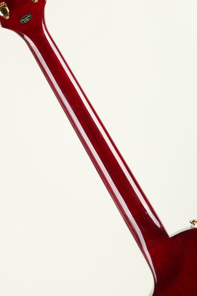 AAAAグレードの薄いメイプル材を配したボディトップに黒々としたエボニー指板、ゴールドカラーで統一されたハードウェア類とのマッチングがゴージャスなルックスの一本です。