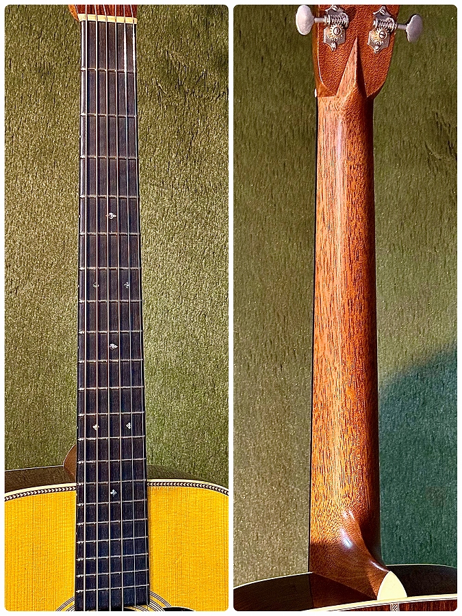 ハンドスキャロップされたフォワード・シフトのXブレイシング、VTS加工(ビンテージトーンシステム)が施されたアディロンダック・スプルーストップとブレイシング材、グアテマラン・ローズウッドのサイド&バック、ボンドでは無くニカワ接着による製作などなど、様々な角度からヴィンテージマーティンを再現する技術が用いられています。