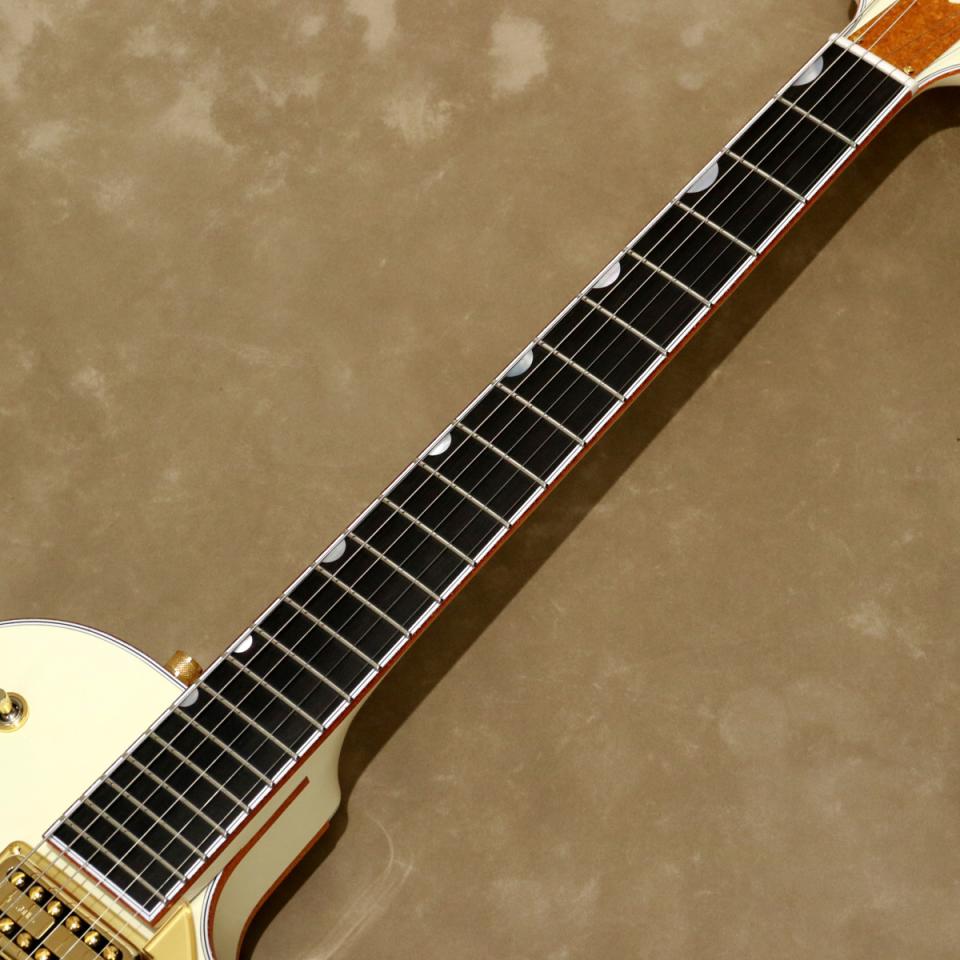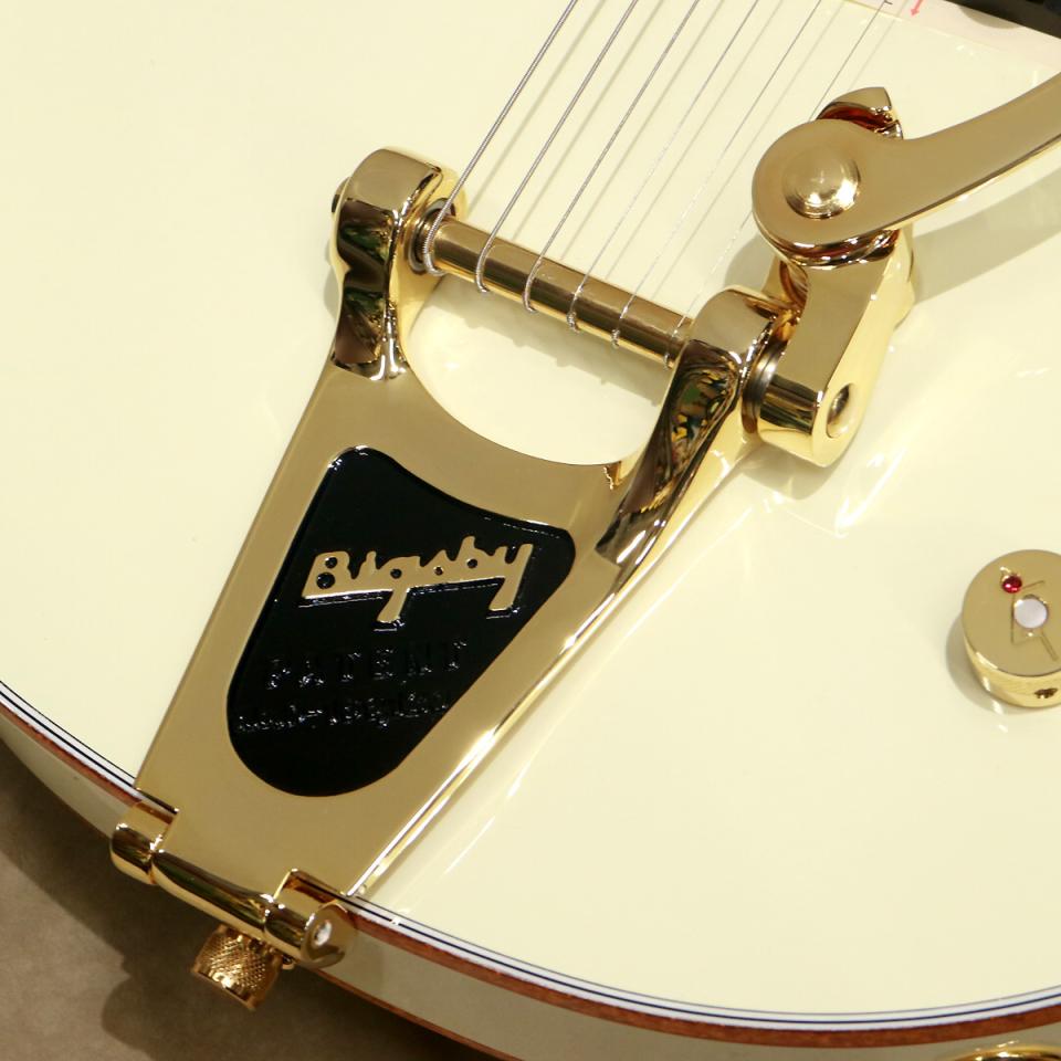 また、ゴールドのエルボー・ガード(バンジョー・アームレスト)、ピンド・エボニー・ベースを組み合わせたスペース・コントロール・ブリッジ、ヴィンテージ・スタイルの厚みのあるピックガード、ジュエルドGアロー・コントロール・ノブ、ゴールド・スパークル・ボディ・バインディングを採用するなど、細部に渡りヴィンテージ・セレクト・エディションの名にふさわしいエレガントなルックスを備えています。